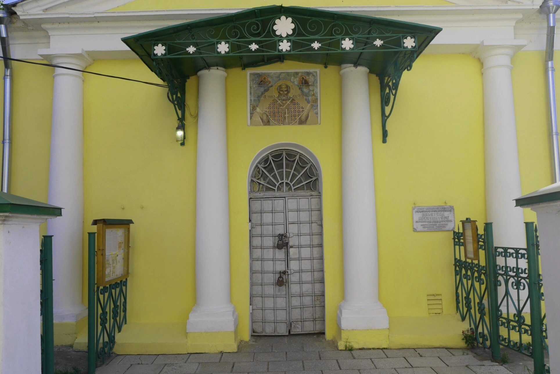 Сами двустворчатые входные двери имеют арочную форму и украшены кованым решетчатым узором, символизирующим как неприступность горнего мира, так и его открытость для верующего сердца. Непосредственно над вратами, в киоте, размещена почитаемая храмовая икона, лик которой встречает и благословляет каждого входящего под священные своды.