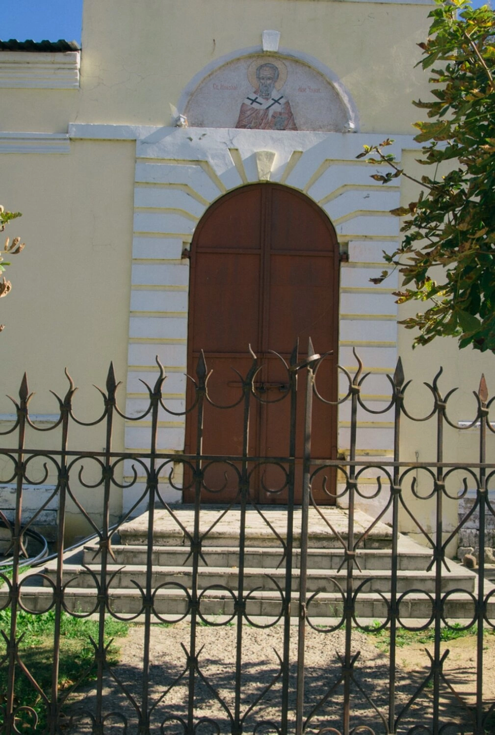 Над двустворчатыми дверями, ведущими в храм, размещена фреска или мозаичная икона Святителя Николая, архиепископа Мир Ликийских, чудотворца, небесного покровителя этой обители. Его лик, обращённый к прихожанам и путникам, встречает всех входящих под церковные своды. К входу ведёт каменная лестница, придающая зданию величие и устремлённость ввысь.