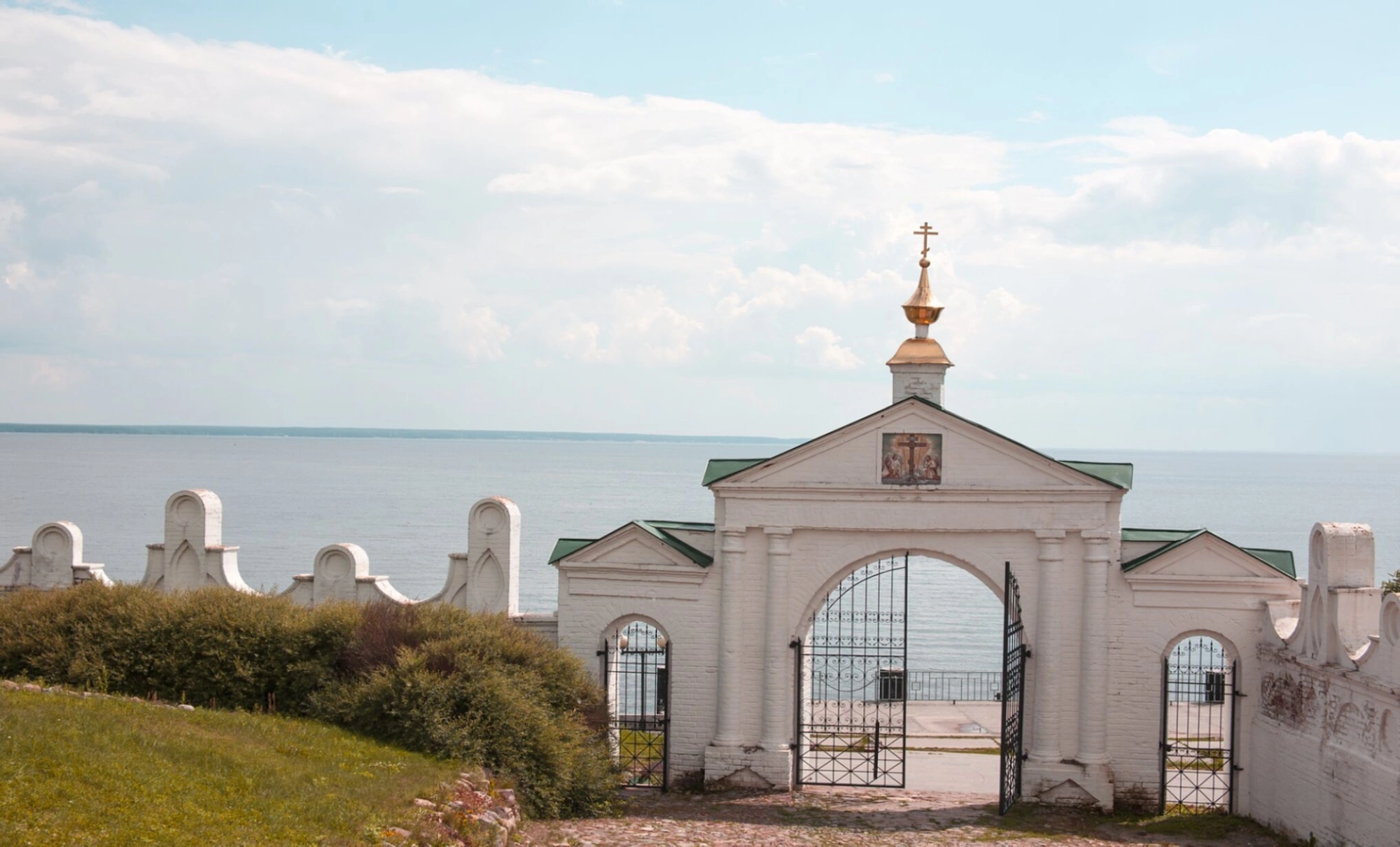 За открытыми створками ворот простирается водная гладь Горьковского водохранилища, образуя величественный и спокойный природный фон для архитектурного ансамбля. Этот вид символизирует незыблемость веры, стоящей на твердом основании, и отражает небесную чистоту.