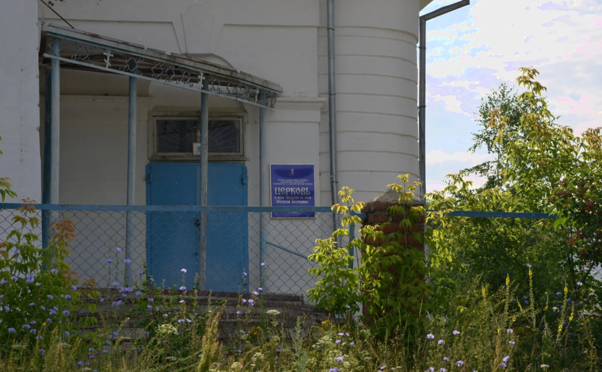 Фотография демонстрирует главный вход в храмовое здание, выполненное в белых тонах. Архитектурный облик характеризуется округлым углом и традиционными для православного зодчества элементами. Фасад несет на себе следы времени, свидетельствуя о долгой истории существования святыни. Входная группа состоит из двух голубых дверей, символизирующих небесную чистоту, и небольшого крыльца, увенчанного металлическим навесом, который требует реставрационных работ.