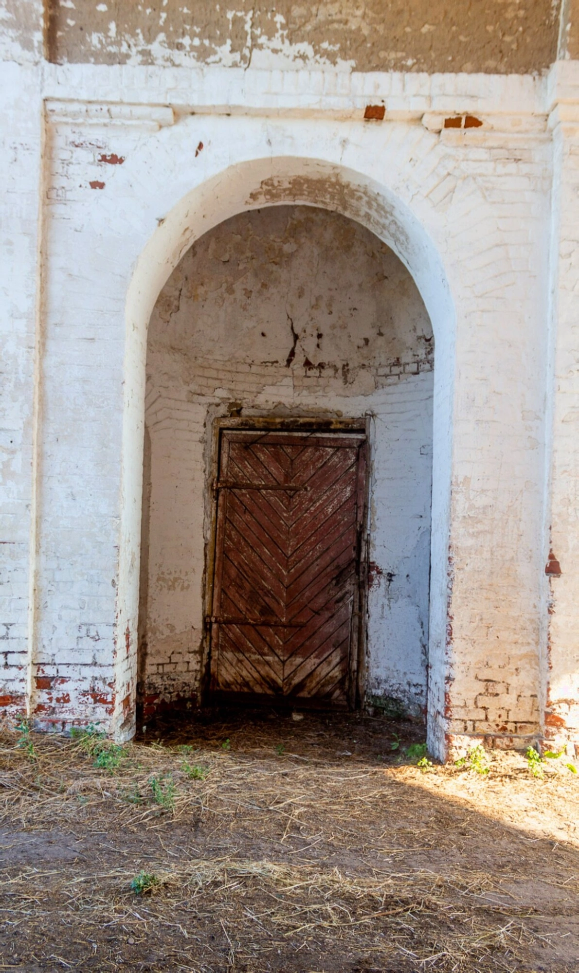 В глубине арки расположена старинная деревянная дверь, изготовленная из широких досок, уложенных по диагонали и образующих характерный узор «ёлочка». Дверное полотно имеет тёмно-коричневый оттенок, а металлические элементы — петли и замок — покрыты заметными следами ржавчины, что свидетельствует о значительном возрасте конструкции.