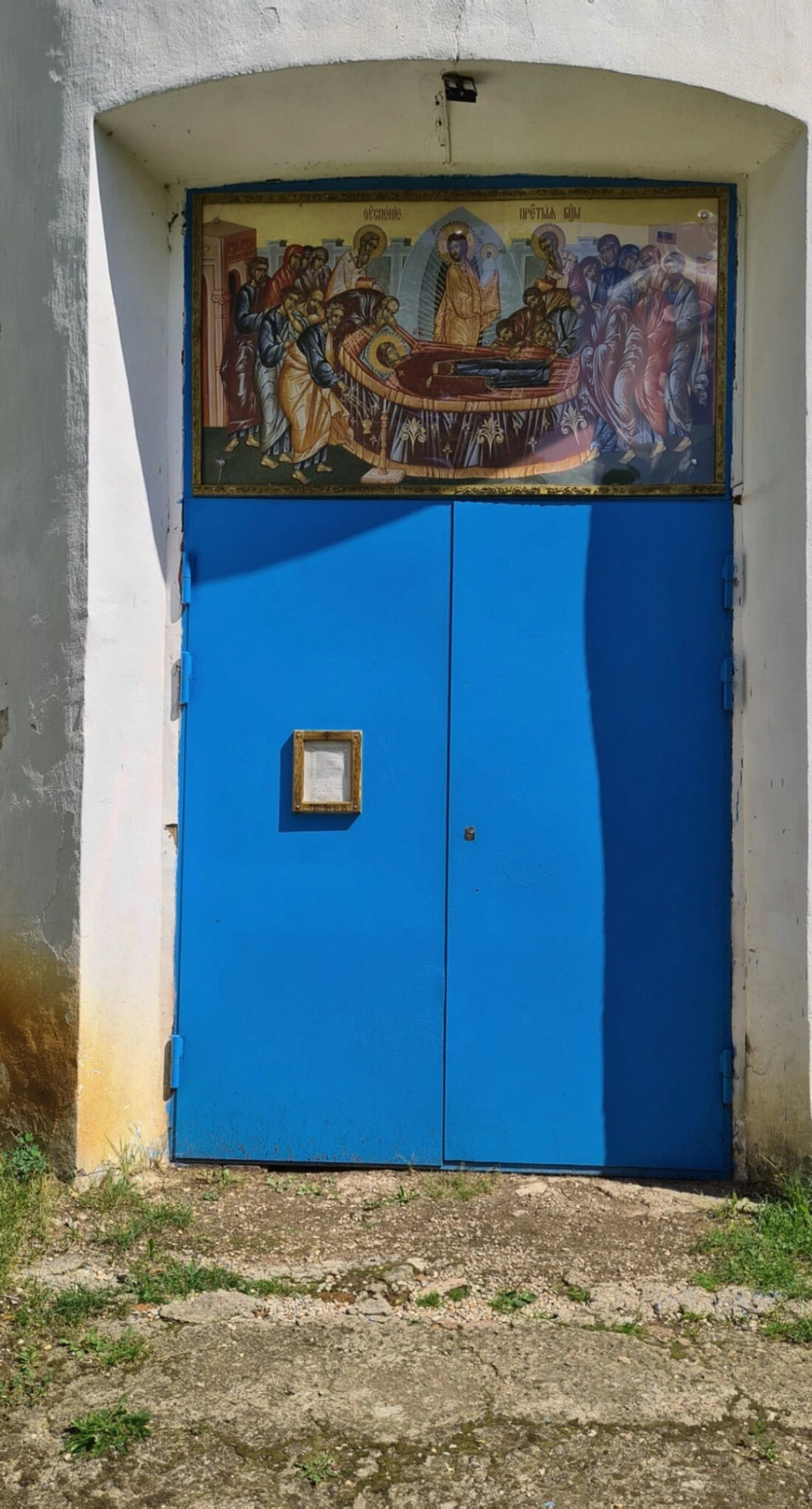 Центральным элемником композиции является массивная двустворчатая дверь, окрашенная в насыщенный синий цвет, что символизирует цвет Богородичных robes и Небесной чистоты. Дверь ведёт верующих внутрь храмового пространства, к молитве и таинствам. Слева от входа размещена большая икона, помещённая в киот, который защищает священное изображение от непогоды. Икона, вероятно, представляет собой образ Успения Пресвятой Богородицы – праздника, в честь которого освящён храм.