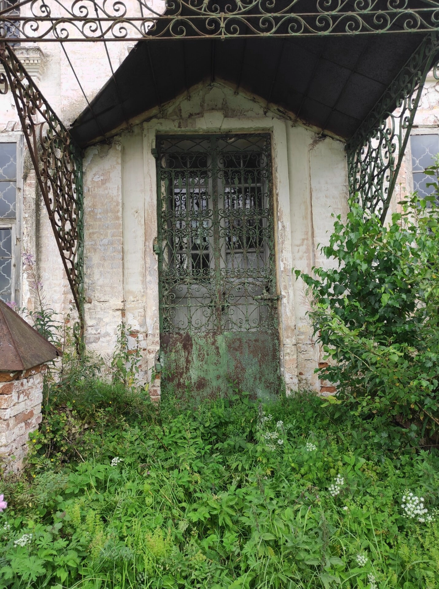 Главным элементом композиции служит массивная металлическая дверь, ведущая в священное пространство храма. Дверное полотно украшено искусными коваными элементами, выполненными в традиционном декоративном стиле, что свидетельствует о высоком уровне мастерства кузнецов прошлого. Приметные следы коррозии и облупившейся краски подчёркивают почтенный возраст конструкции и её подлинность.