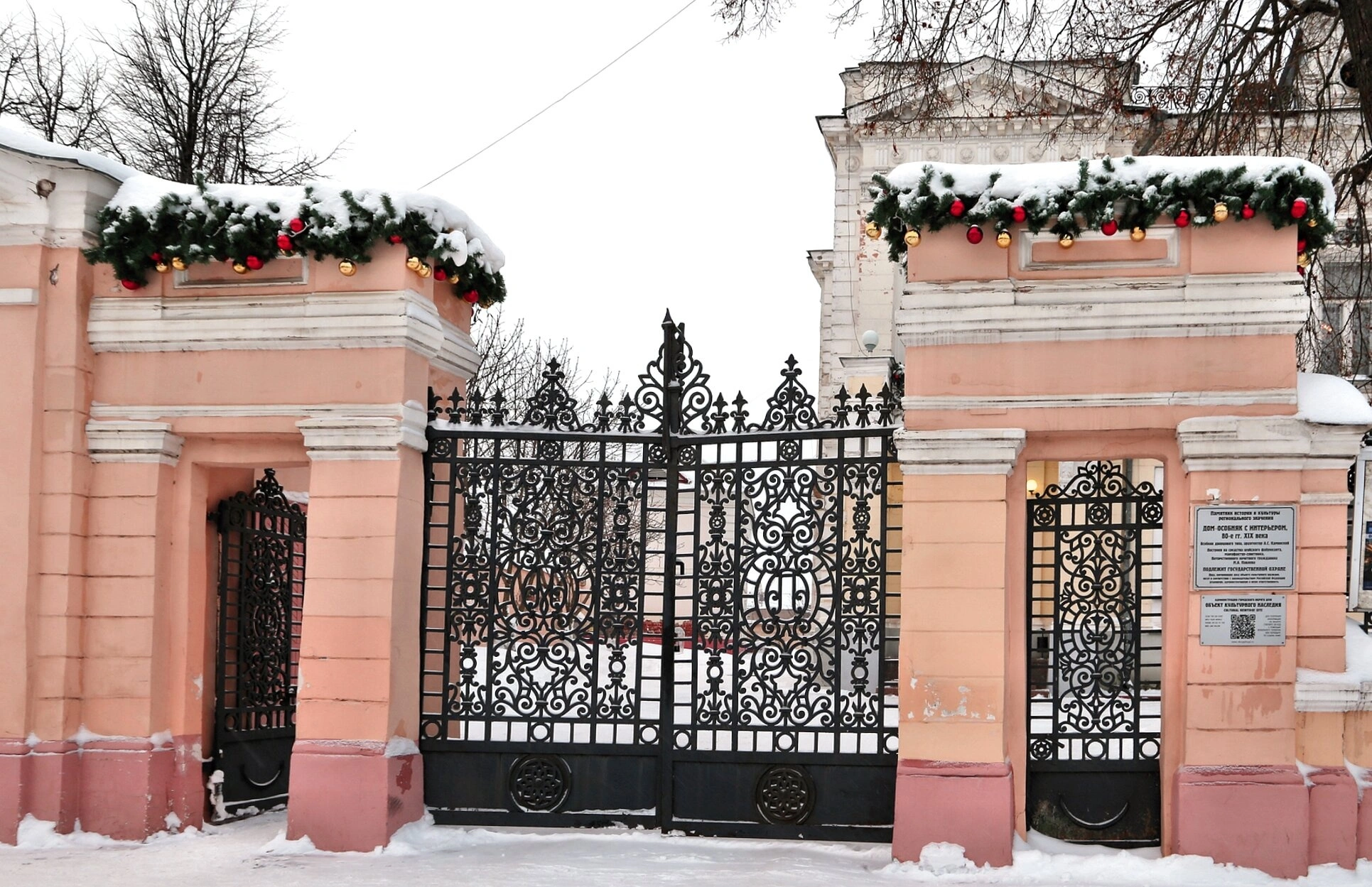 Колонны и часть ограждения украшены еловыми гирляндами с красными и золотыми шарами, что свидетельствует о праздновании Рождества Христова или Нового года. Снег, покрывающий ворота, колонны и прилегающую территорию, создает особую благоговейную атмосферу зимней поры. На правой колонне размещена информационная табличка для паломников и прихожан.