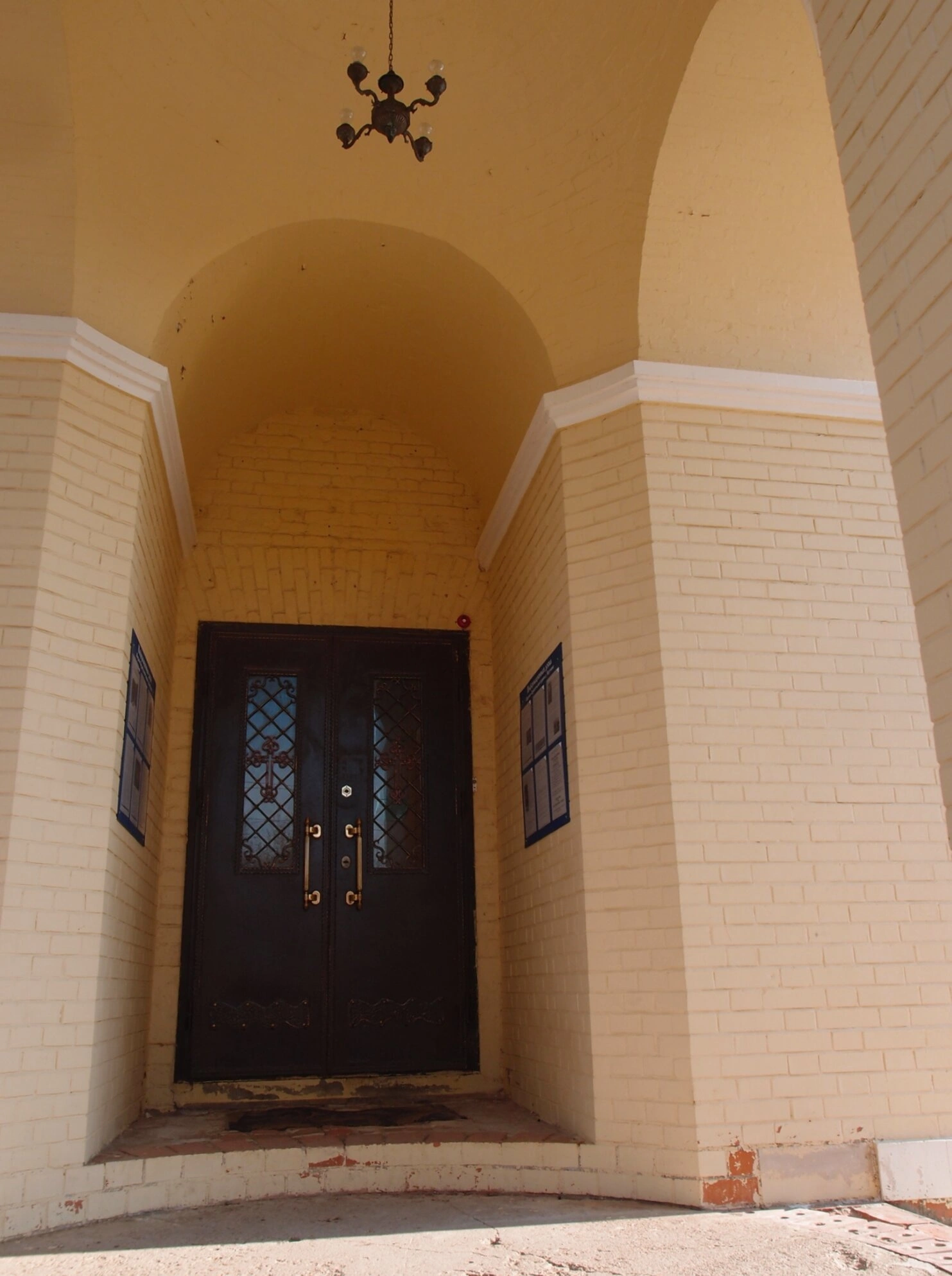 Входная группа храма оформлена с благородной строгостью. Портал образует монументальный арочный свод, поддерживаемый колоннами из светлого кирпича, что создаёт ощущение величия и устремлённости ввысь. Центральным элементом композиции являются массивные двустворчатые врата из тёмного дерева, украшенные скромным, но выразительным убранством. Верхняя часть врат дополнена вставками с решетчатыми окнами, пропускающими естественный свет в притвор храма.