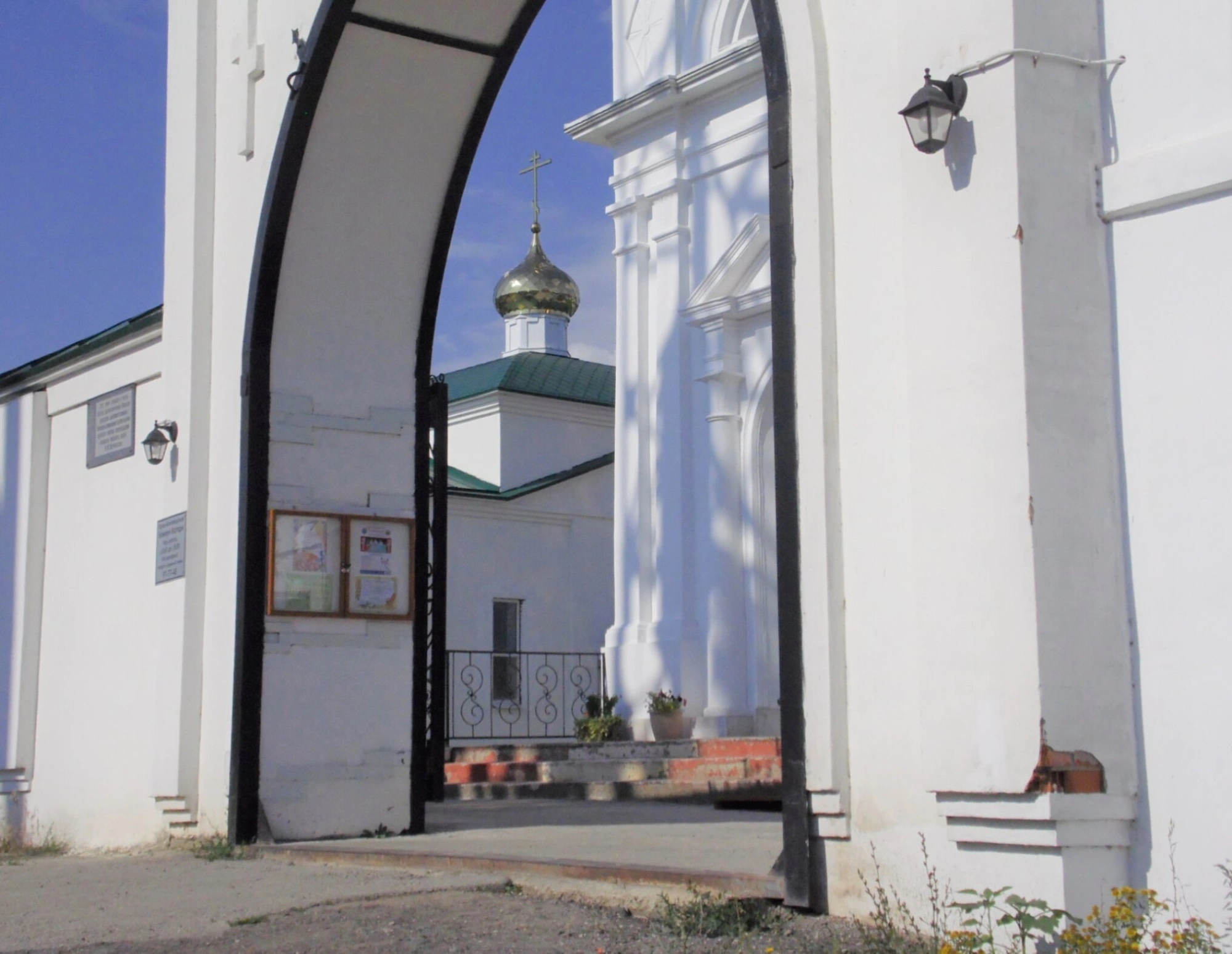 У основания снимка различима земля с произрастающей на ней зеленью, что придаёт кадру ощущение ухоженности и гармонии с природой. На внутренней поверхности арки, с левой стороны, размещены информационные стенды, которые, вероятно, содержат сведения о расписании богослужений, храмовых святынях и предстоящих церковных праздниках, что является неотъемлемой частью жизни любого прихода.