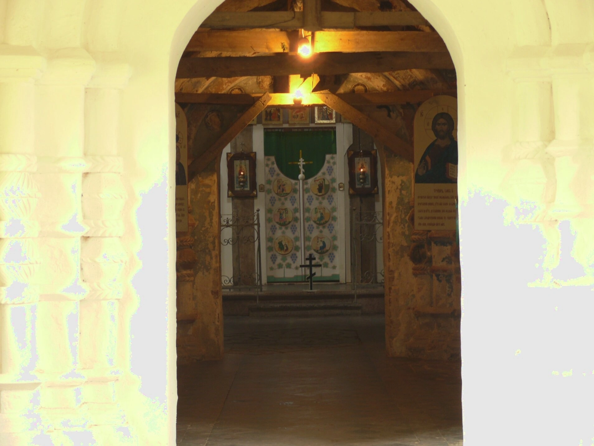 В центральной части композиции возвышается арочный проём, ведущий в основное помещение церкви. По обе стороны от арки размещены святые образа в традиционных православных киотах. Иконы украшены ризами и расположены в соответствии с канонами церковного убранства.