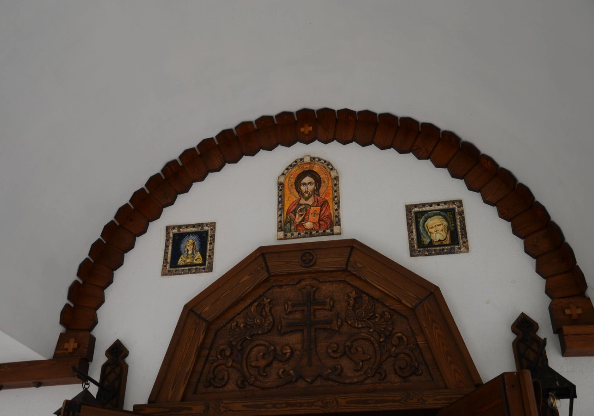 На стене над арочным проёмом расположены три особо почитаемые иконы. В центре находится образ Господа нашего Иисуса Христа, по левую сторону - образ Пресвятой Богородицы с Младенцем, а по правую сторону - икона преподобного Серафима Саровского, чьё имя носит данный храм. Святой Серафим изображён в традиционной иконографии - в монашеском облачении с седой длинной бородой.