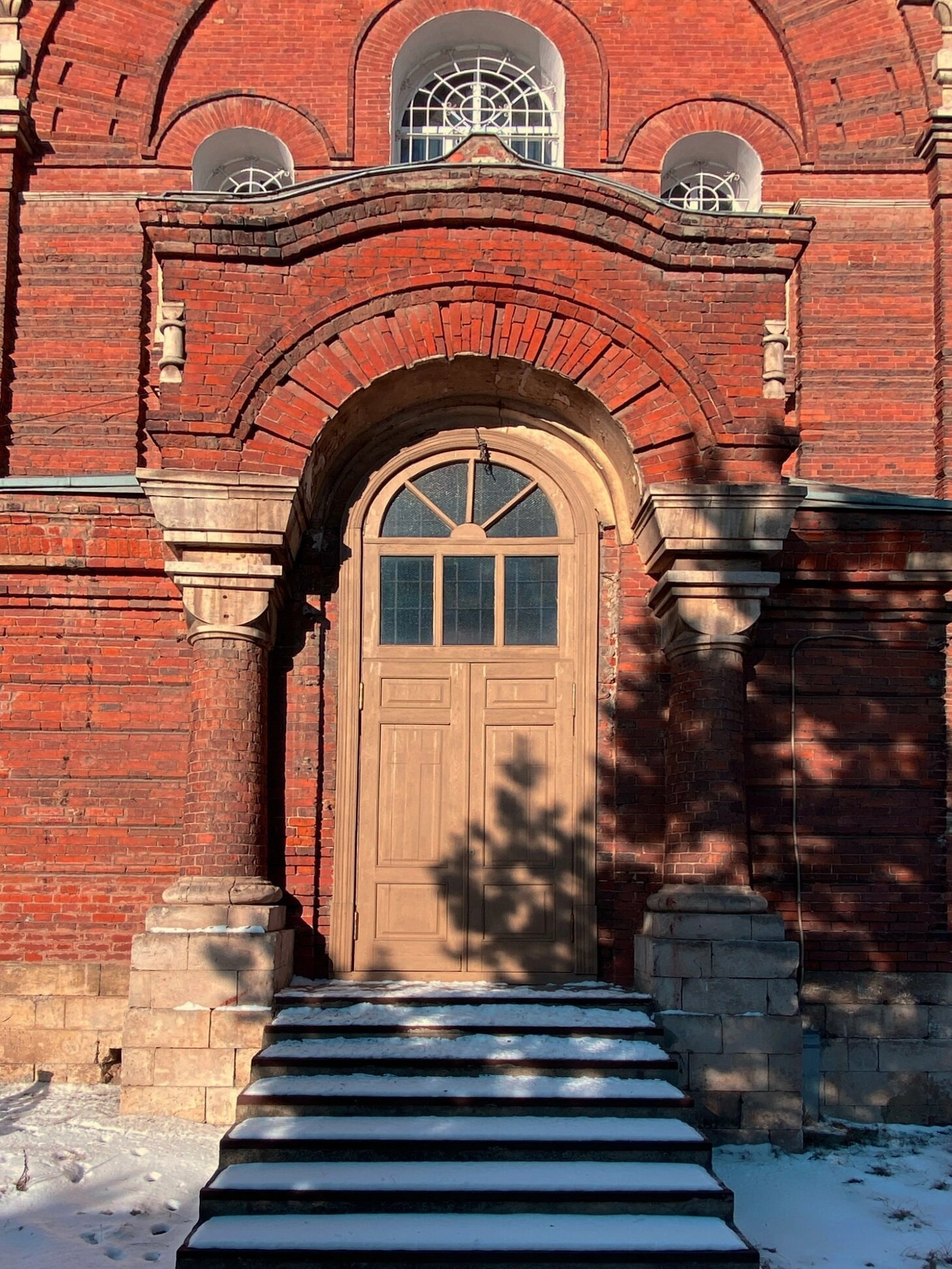Снимок сделан в зимнее время, о чём свидетельствует снег, покрывающий ступени лестницы перед входом. Солнечный свет, падающий на фасад, создаёт глубокие тени от окружающих деревьев, играя на фактуре кирпичной кладки и усиливая живописность и духовную атмосферу места. Этот храм является не только архитектурным достоянием, но и активным духовным центром, где непрестанно возносятся молитвы ко Господу и Его угоднику, Преподобному Сергию.