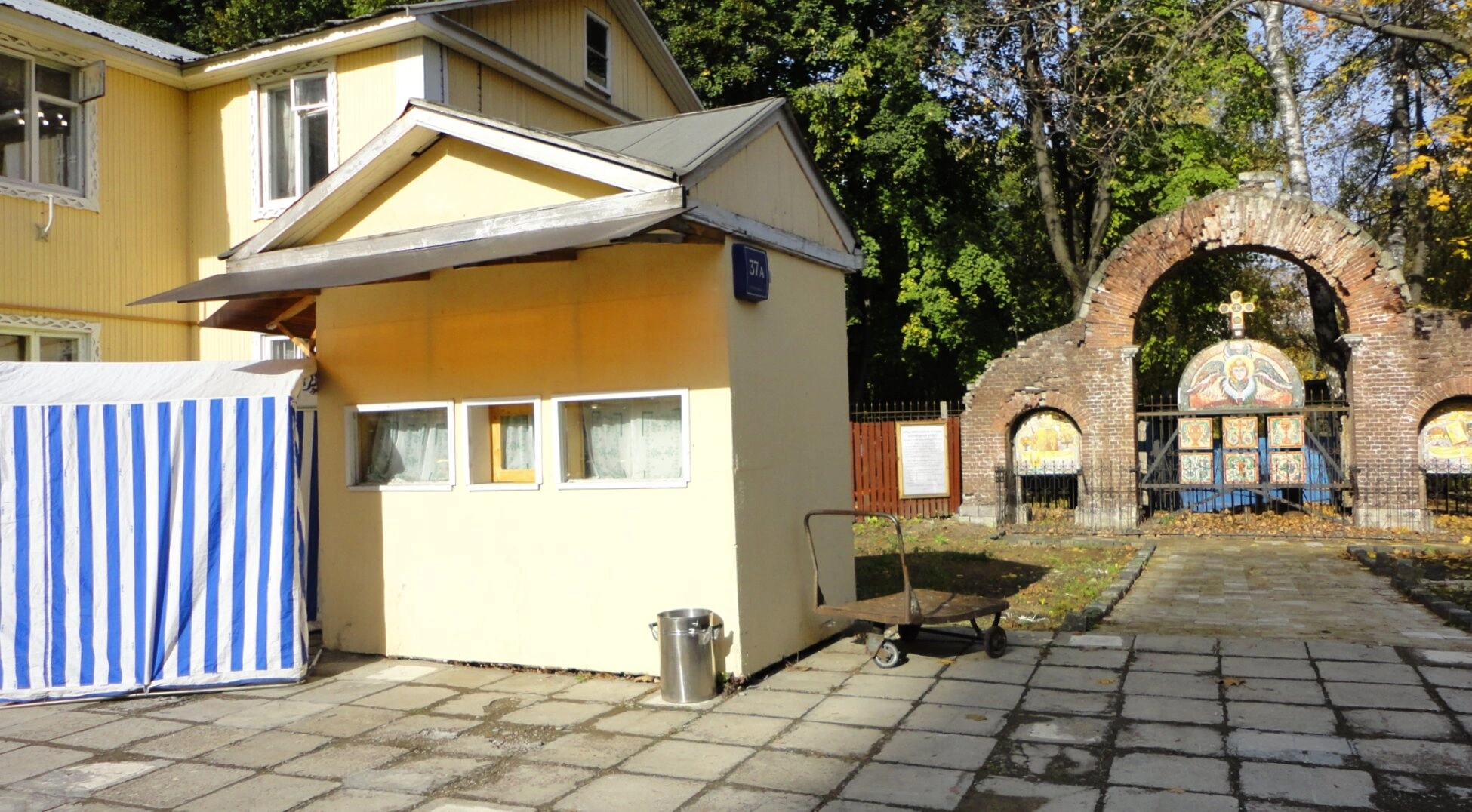 Справа от входа просматривается часть храмового здания, окрашенного в благолепный желтый цвет, характерный для многих православных церквей России. Архитектурный облик строения отражает особенности церковного зодчества, где каждый элемент имеет символическое значение и направлен к горнему миру.
