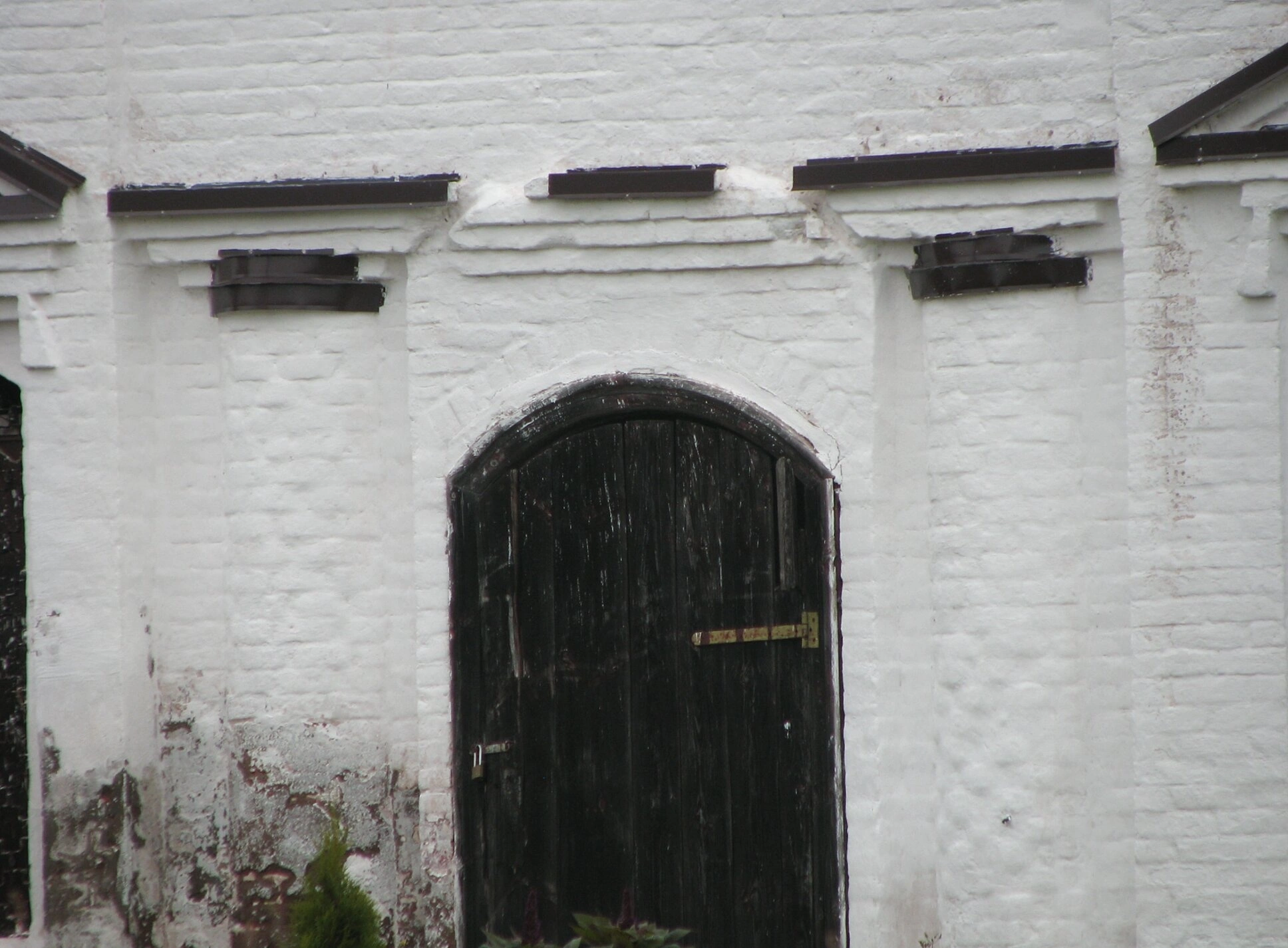 Белоснежная кирпичная кладка стены, несущая на себе следы времени и воздействия непогоды, свидетельствует о почтенном возрасте святой обители. Арочная форма входа, увенчанная тёмной деревянной дверью с коваными металлическими элементами, является характерным образцом церковного зодчества, распространённого в русской провинции. Над дверью и по сторонам проёма размещены выступающие декоративные элементы из тёмного дерева, выполняющие функцию наличника и подчёркивающие сакральную значимость входа в дом Божий.