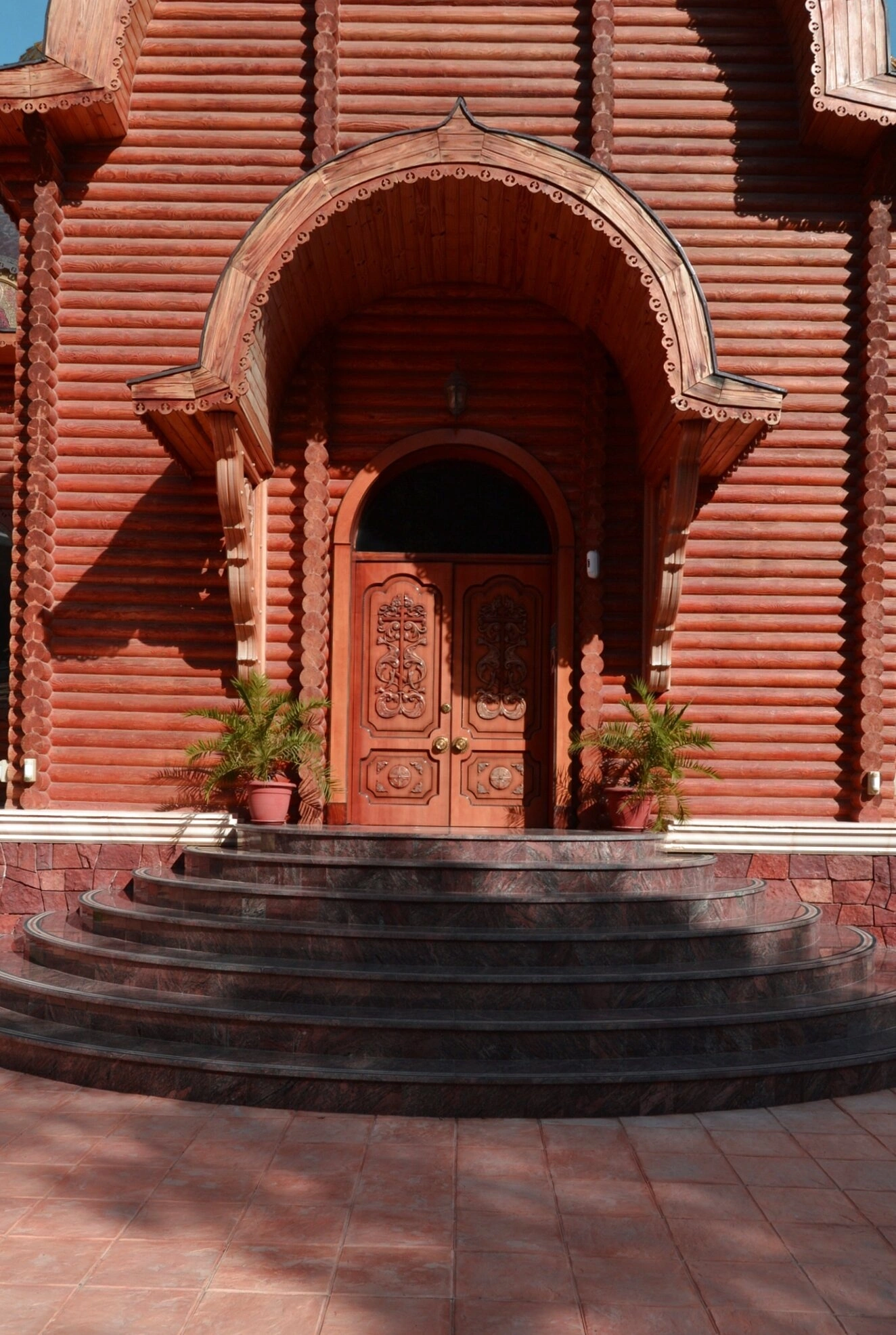 К порталу храма ведёт широкая полукруглая лестница, выложенная из тёмного камня, что придаёт всему сооружению особую монументальность и величие. По обеим сторонам от двери на верхних ступенях установлены кадки с вечнозелёными растениями, что добавляет элемент благолепия и уюта.