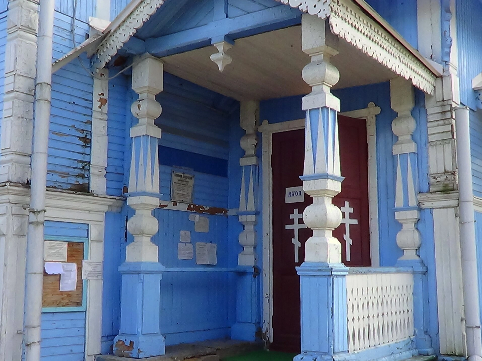 В центре композиции — крытый резной портик, ведущий к вратам храма. Деревянные колонны поддерживают навес, создавая лёгкое и воздушное пространство перед входом. Ажурные резные перила и детали украшения свидетельствуют о внимании мастеров к каждой детали. Дверь, окрашенная в тёплый красный цвет, символизирующий торжество и красоту православной веры, является смысловым центром фасада.