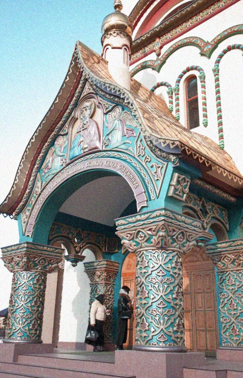 По сторонам от входа можно предположить наличие мощных колонн или пилястр, которые придают всей композиции величие и устойчивость, олицетворяя твёрдость православного исповедания. Кровля над входом, вероятно, увенчана православным крестом, осеняющим всех входящих под священный свод храма для молитвы.
