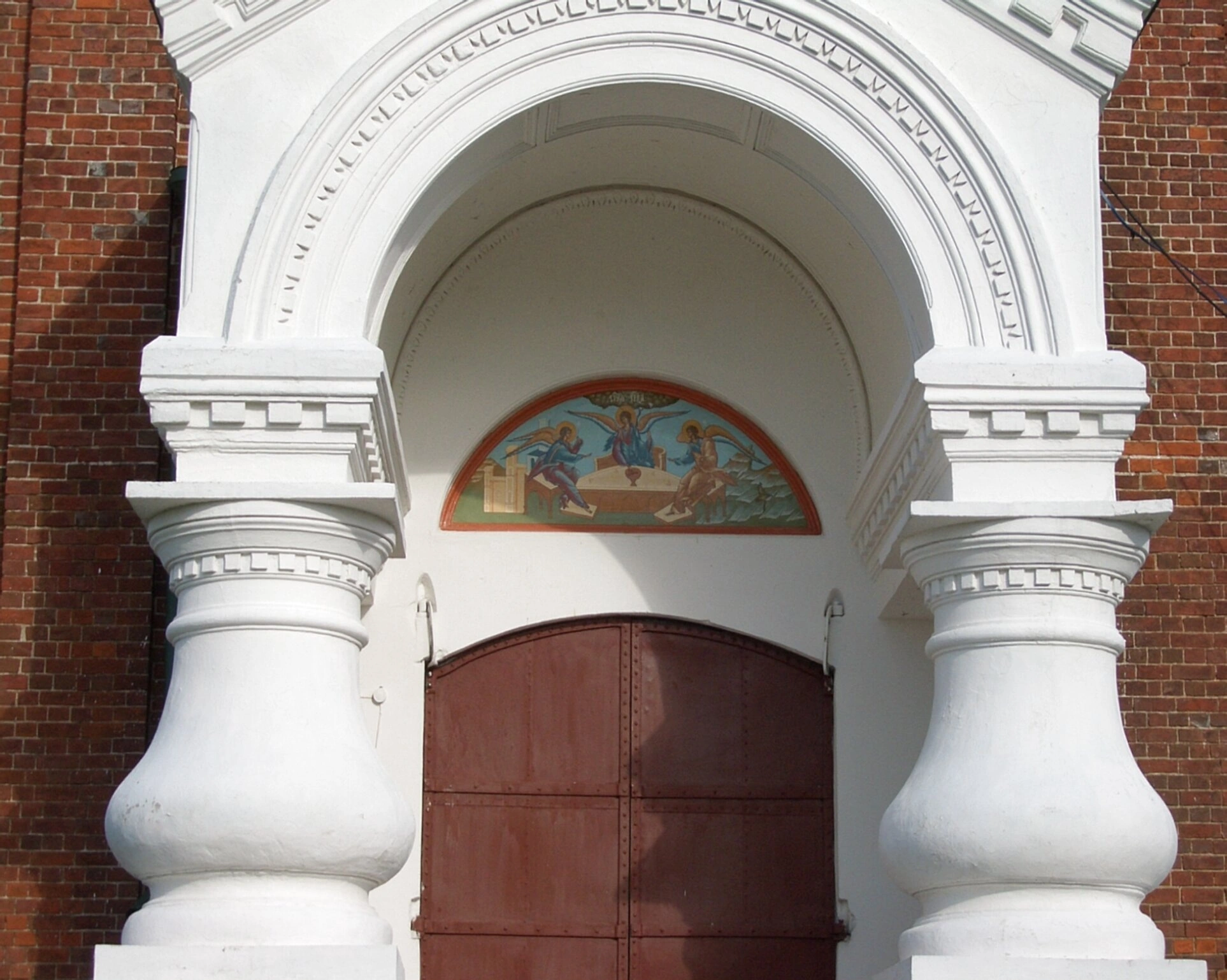 Портал входа оформлен двумя массивными колоннами, которые не только несут архитектурную нагрузку, но и символизируют опору и твёрдость веры. Над дверным проёмом, в закомаре арки, размещена прекрасно сохранившаяся фреска. Иконографический сюжет росписи, выполненный в тёплых, канонических тонах, призван благословлять входящих в Дом Божий и настраивать их на молитвенный лад.