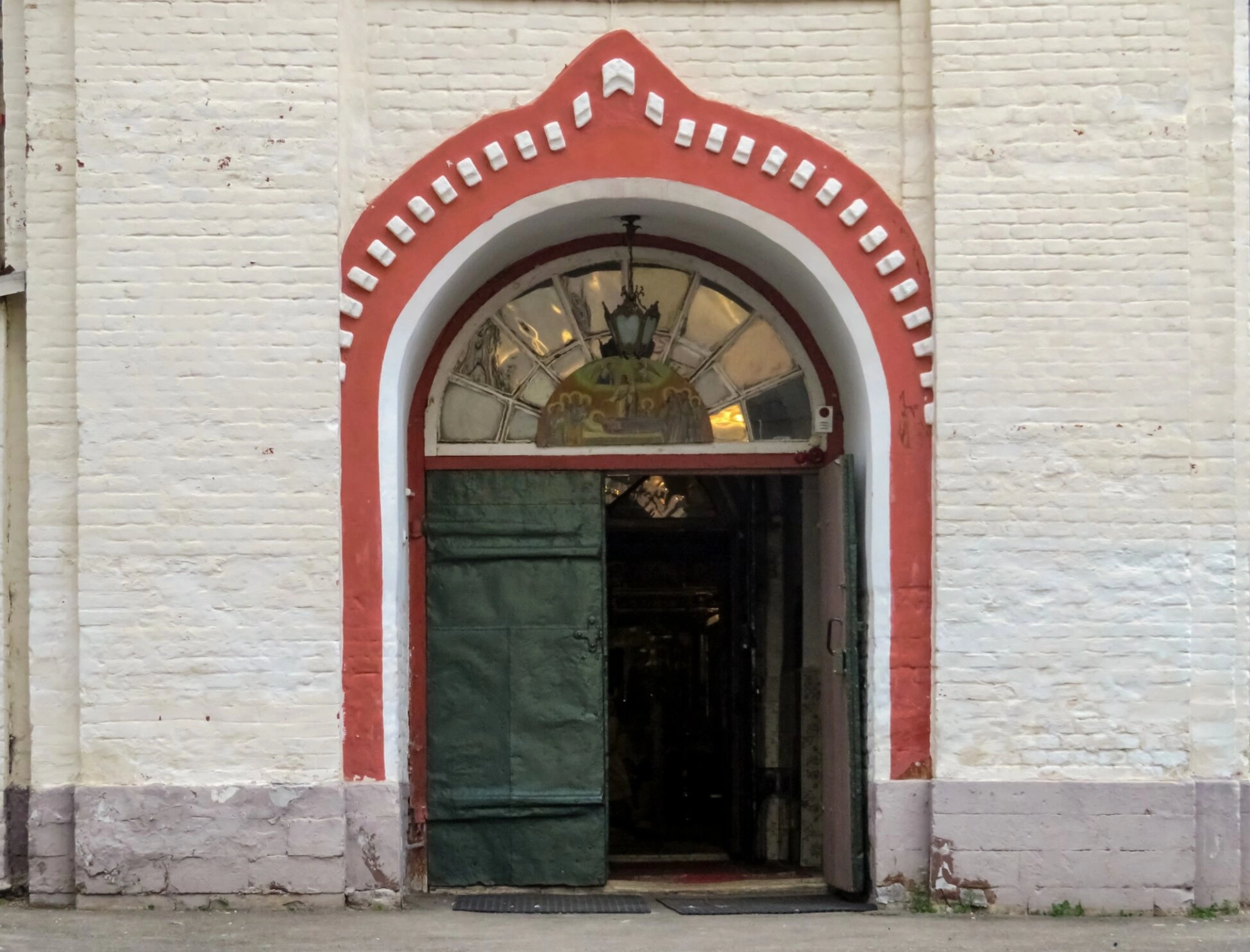 Архитектурное решение входной группы отличается благородной строгостью и соответствует канонам православного зодчества. Вход оформлен в виде арочного портала, обрамлённого нарядным орнаментом, выполненным в красных тонах с изящными белыми деталями. Стены, сложенные из белого кирпича, контрастируют с серым цоколем, что придаёт фасаду особую монументальность и устойчивость.