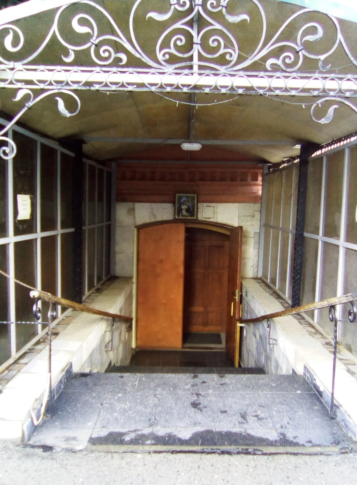 Взгляд приковывает ажурный кованый навес, венчающий входную группу. Его декоративные элементы, вероятно, включающие в себя христианскую символику, не только выполняют защитную функцию, но и символически осеняют каждого входящего под покровом Божиим. Спуск по лестнице, обрамлённый изящными перилами с коваными узорами, знаменует собой путь молитвенного предстояния и смирения перед переходом в священное пространство храма.