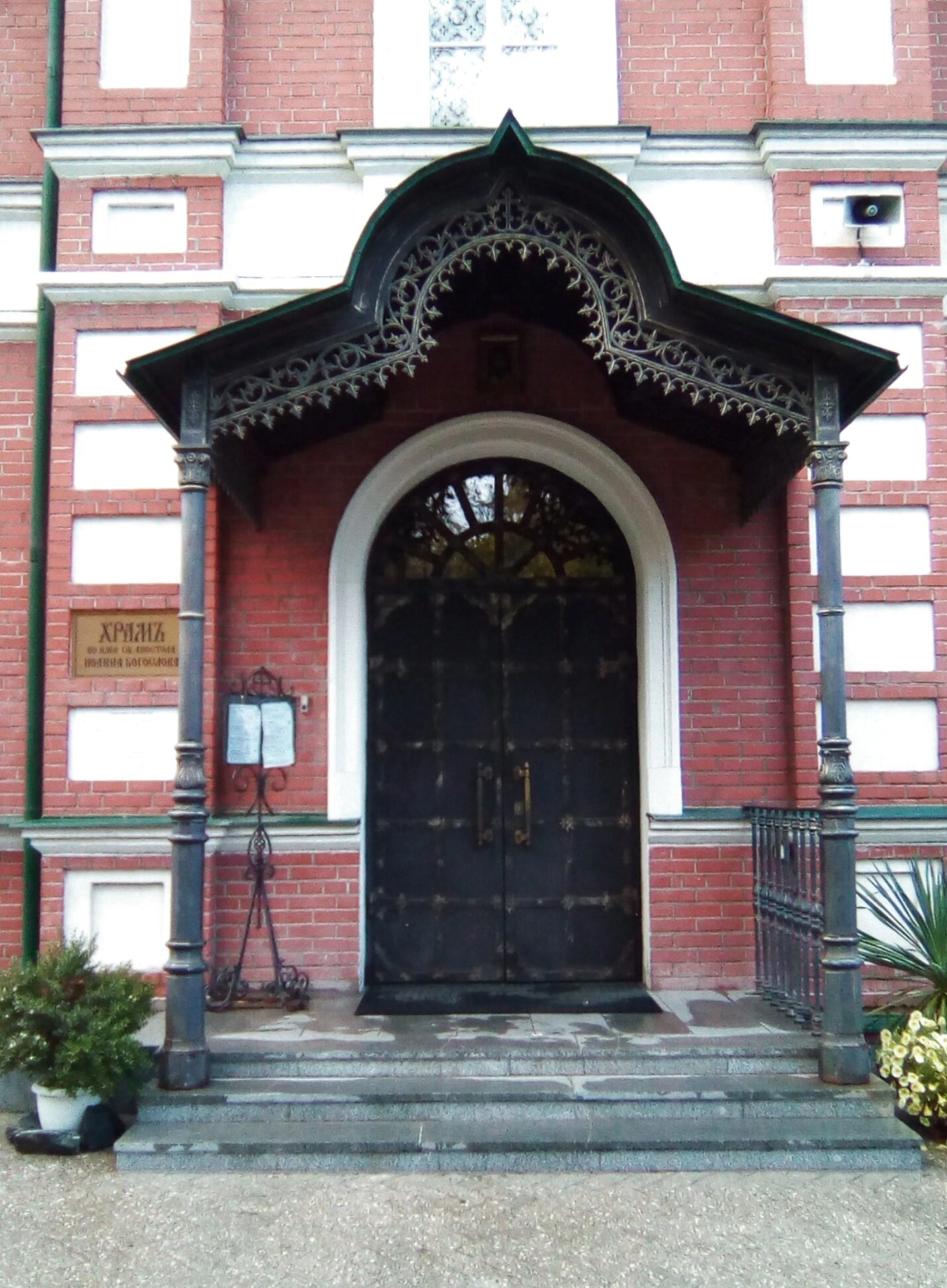 Фотография позволяет детально рассмотреть кирпичный фасад здания, выполненный в традициях русского церковного зодчества. Центральным элементом композиции служит арочный вход, увенчанный благолепным кованым навесом, который поддерживают массивные колонны. Навес не только выполняет практическую функцию защиты от непогоды, но и придаёт внешнему облику храма особую торжественность и завершённость.
