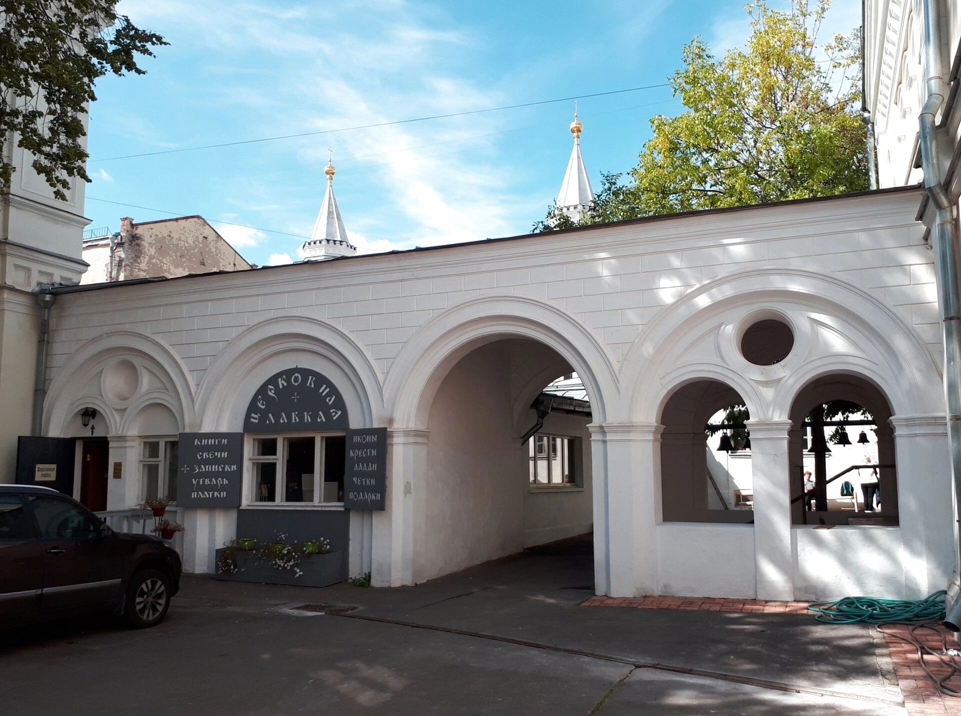 На фотографии запечатлён главный вход в ставропигиальный Иоанно-Предтеченский женский монастырь, расположенный в самом сердце Москвы. Святые врата обители, увенчанные благодатной аркой, приглашают верующих в духовную ограду этого древнего святого места. Справа от входа располагается церковная лавка, где паломники и прихожане могут приобрести всё необходимое для молитвы: православные книги, свечи, иконы, нательные крестики, освященное масло и церковную утварь, а также подать записки о здравии и упокоении.