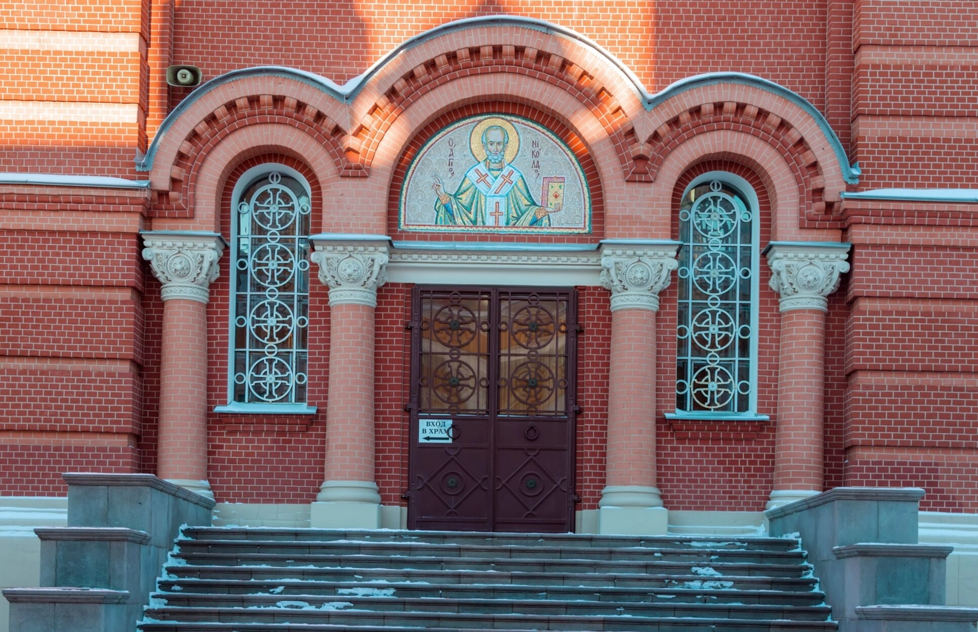 Арка главного входа, украшенная килевидным кокошником и увенчанная православным крестом, призывает верующих к молитве и символизирует врата в духовный мир. Массивные деревянные двери, обрамлённые каменным резным порталом, ведут в пространство храма, освящённое во имя одного из самых почитаемых на Руси святых — святителя Николая, архиепископа Мир Ликийских.