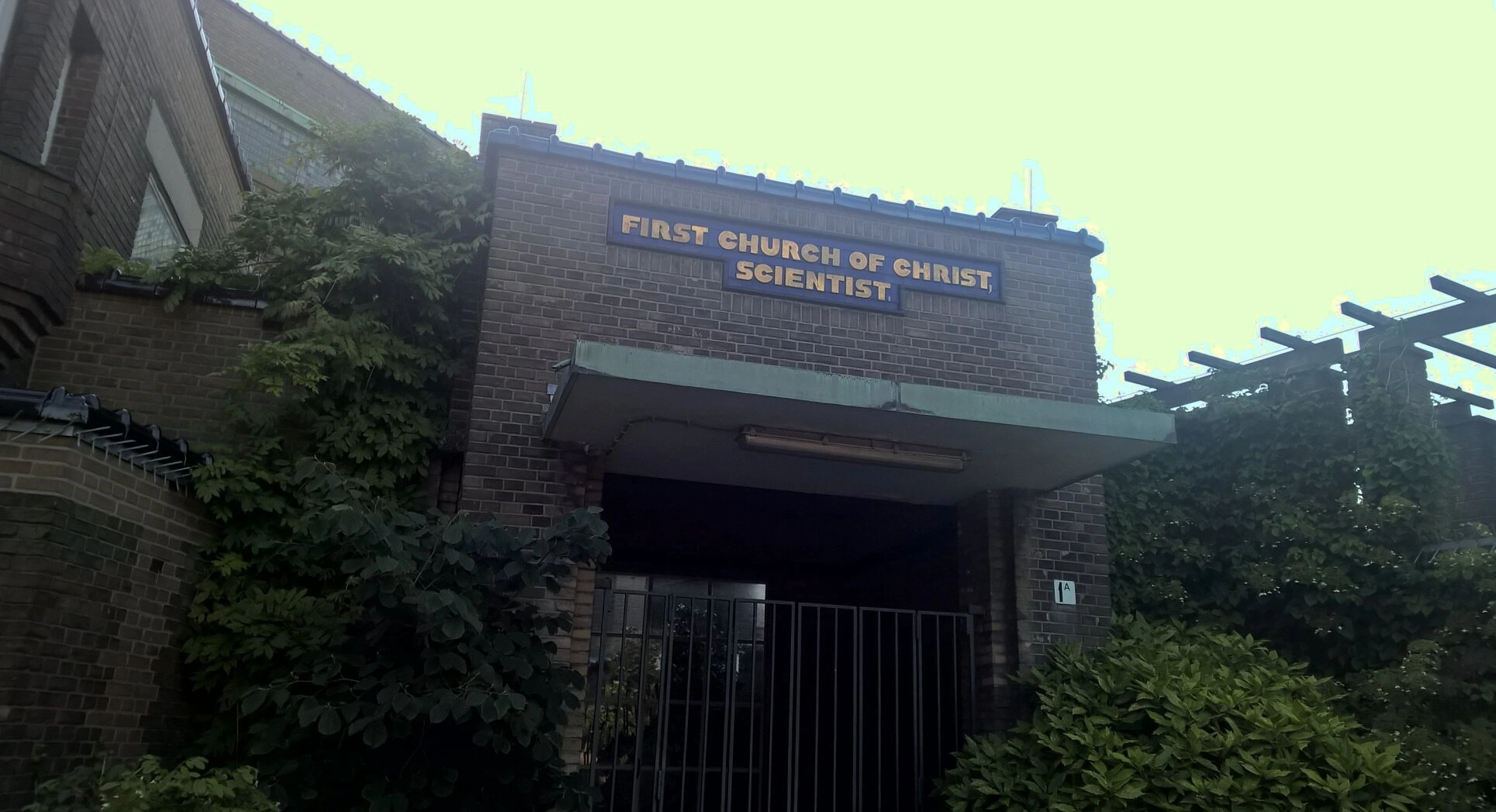 На представленной фотографии запечатлен вход в молитвенное здание общины Первой Церкви Христа, Ученого, расположенное в нидерландском городе Гаага. Снимок позволяет внимательно рассмотреть архитектурные особенности этого современного строения, возведенного из темного кирпича.