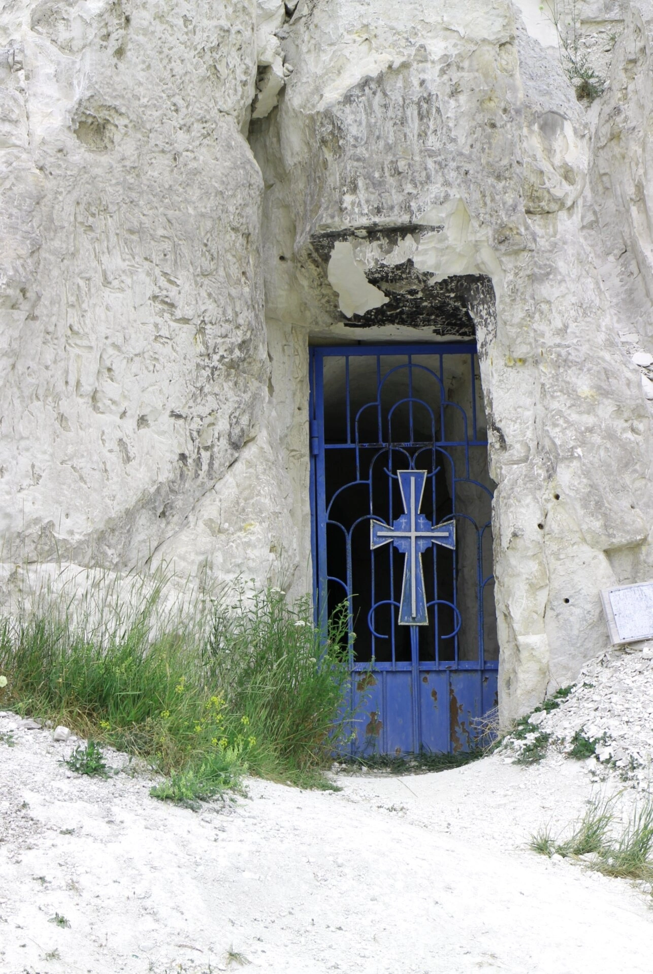 Вход в храм, имеющий явно рукотворное происхождение, аккуратно вырублен в меловой скале светлого оттенка. Его охраняет массивная металлическая дверь синего цвета, украшенная православным крестом, что сразу указывает на религиозное назначение места. Дверь символизирует собой переход от мира мирского к пространству молитвенного уединения и сосредоточенности. Вокруг входа произрастает трава, а к нему ведёт грунтовая тропа, что подчёркивает гармоничное единение творения рук человеческих с нетронутой природой этой святой земли.