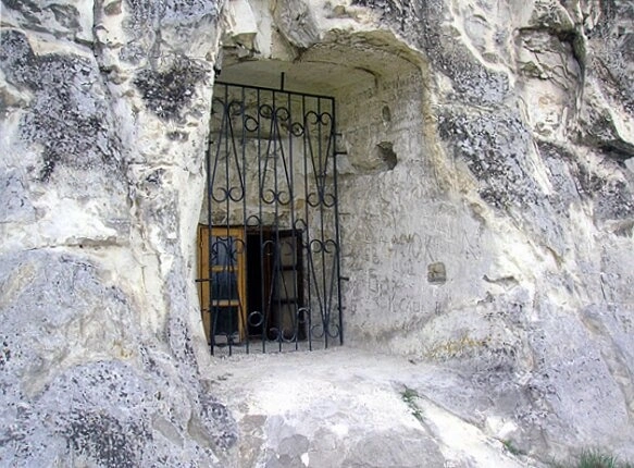 На представленной фотографии запечатлён вход в один из древних пещерных храмов, высеченных в меловой толще горного склона. Это святое место является частью ансамбля Свято-Успенского Дивногорского мужского монастыря, расположенного в музее-заповеднике «Дивногорье» Воронежской области. Проём в скале, обрамлённый массивной деревянной дверью и кованой металлической решёткой, ведёт в глубину мелового массива, где в тишине и благодатном мраке находятся келии и молитвенные помещения, созданные трудом и молитвой православных подвижников.