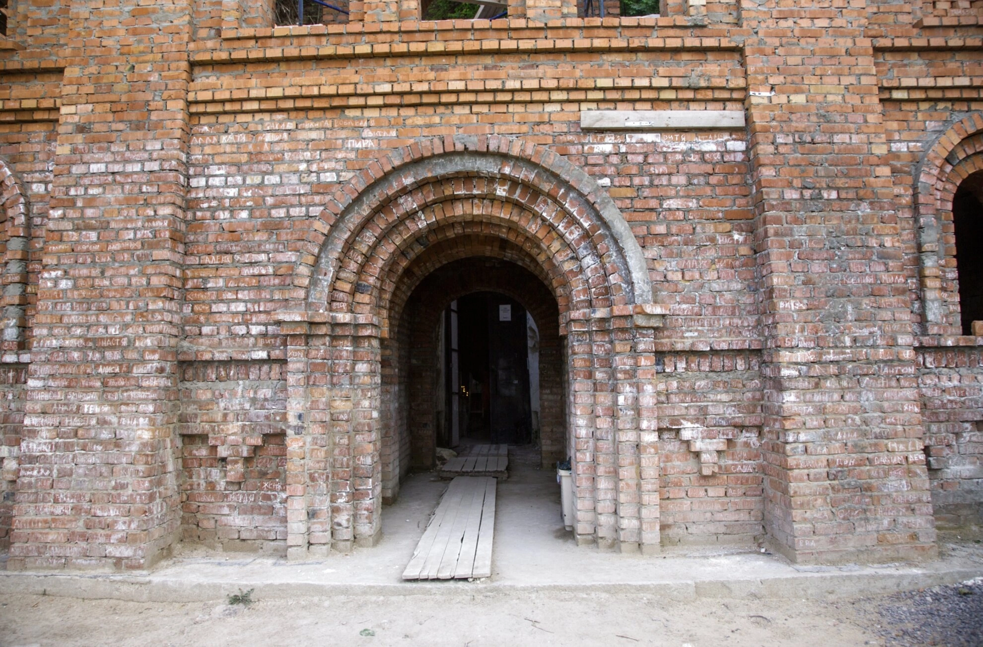 На фотографии запечатлён вход в пещерный комплекс Белогорского Воскресенского мужского монастыря, расположенного в Воронежской области. Этот кирпичный портал является вратами в обширные рукотворные пещеры, вырубленные в меловой горе над Доном.
