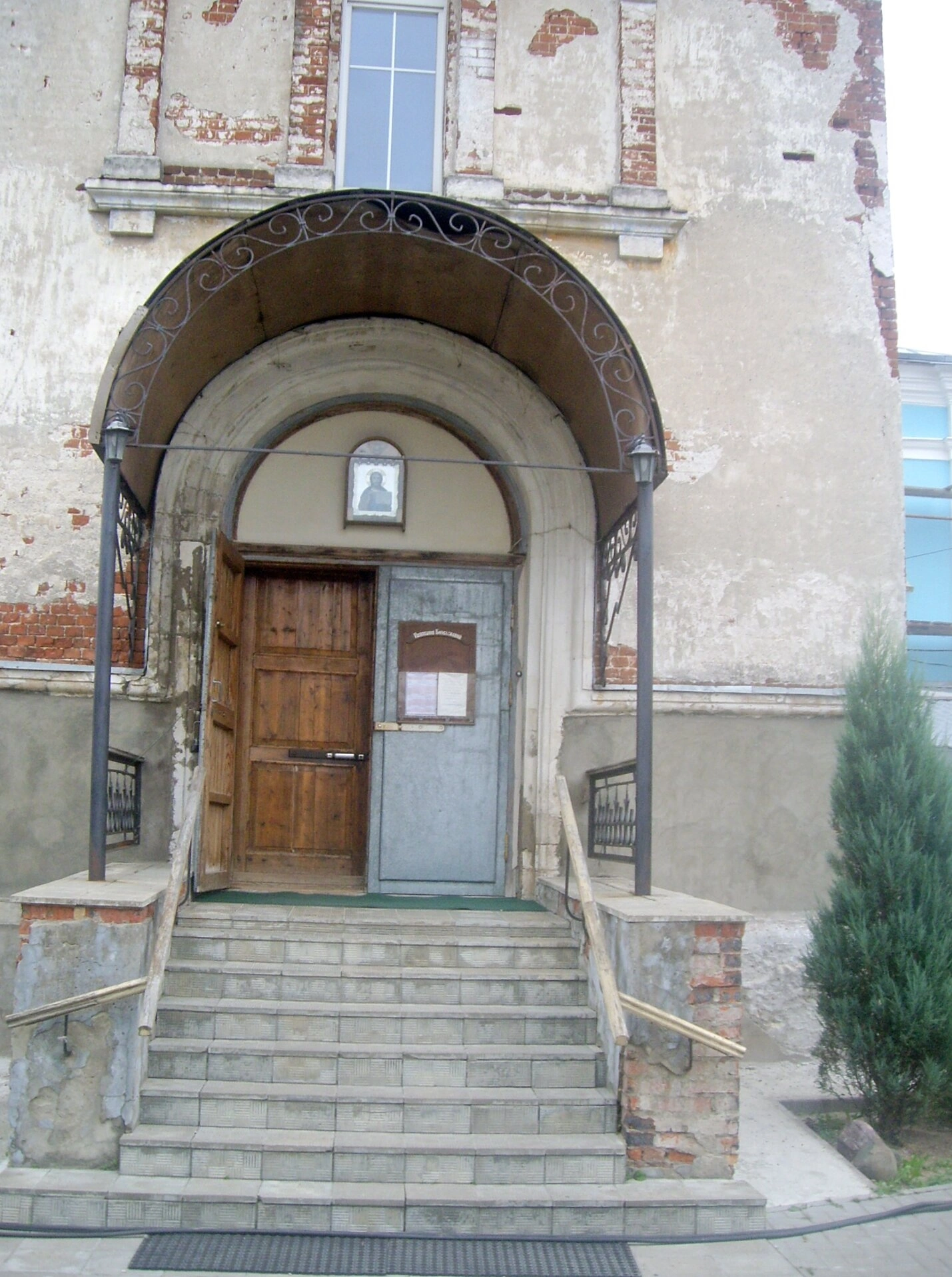 К входу ведёт каменная лестница, обрамлённая перилами и массивными кирпичными основаниями. Фасад здания, частично оштукатуренный, носит следы времени и требует попечения, местами обнажая древнюю кирпичную кладку. Справа от лестницы растёт небольшое хвойное дерево, символически напоминая о вечной жизни. Этот храм является не только архитектурным памятником, но и действующим домом молитвы, свидетельствующим о вере и благочестии многих поколений.