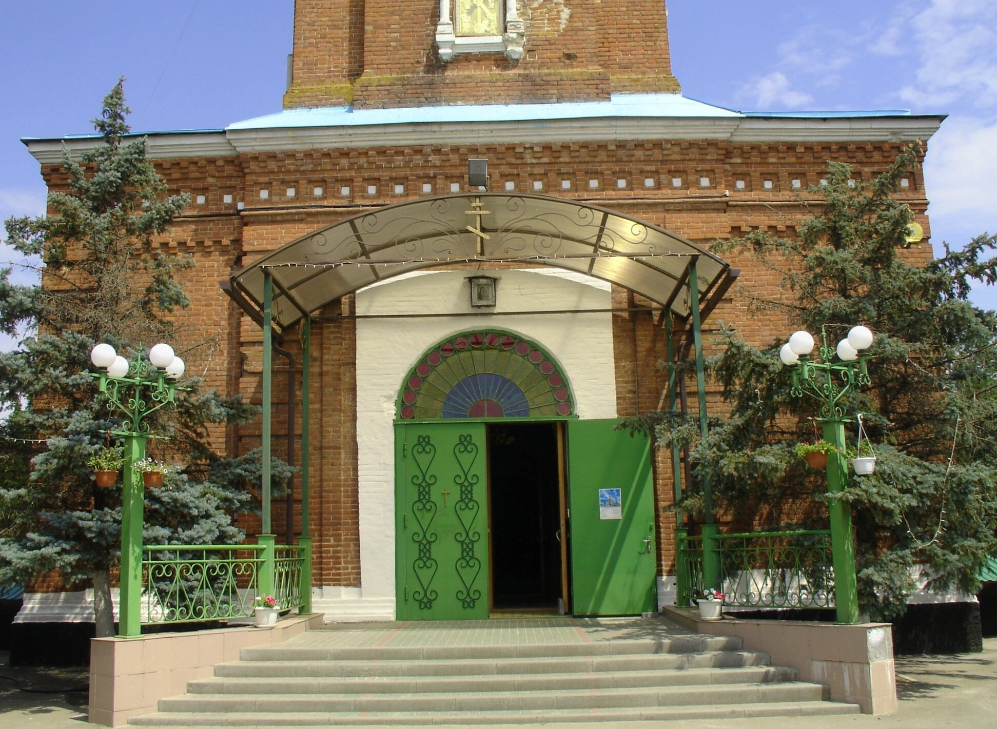 На представленной фотографии запечатлен главный вход в храм Преображения Господня, расположенный в селе Обуховка Ростовской области. Святыня, возведенная из красного кирпича, представляет собой прекрасный образец церковной архитектуры юга России.