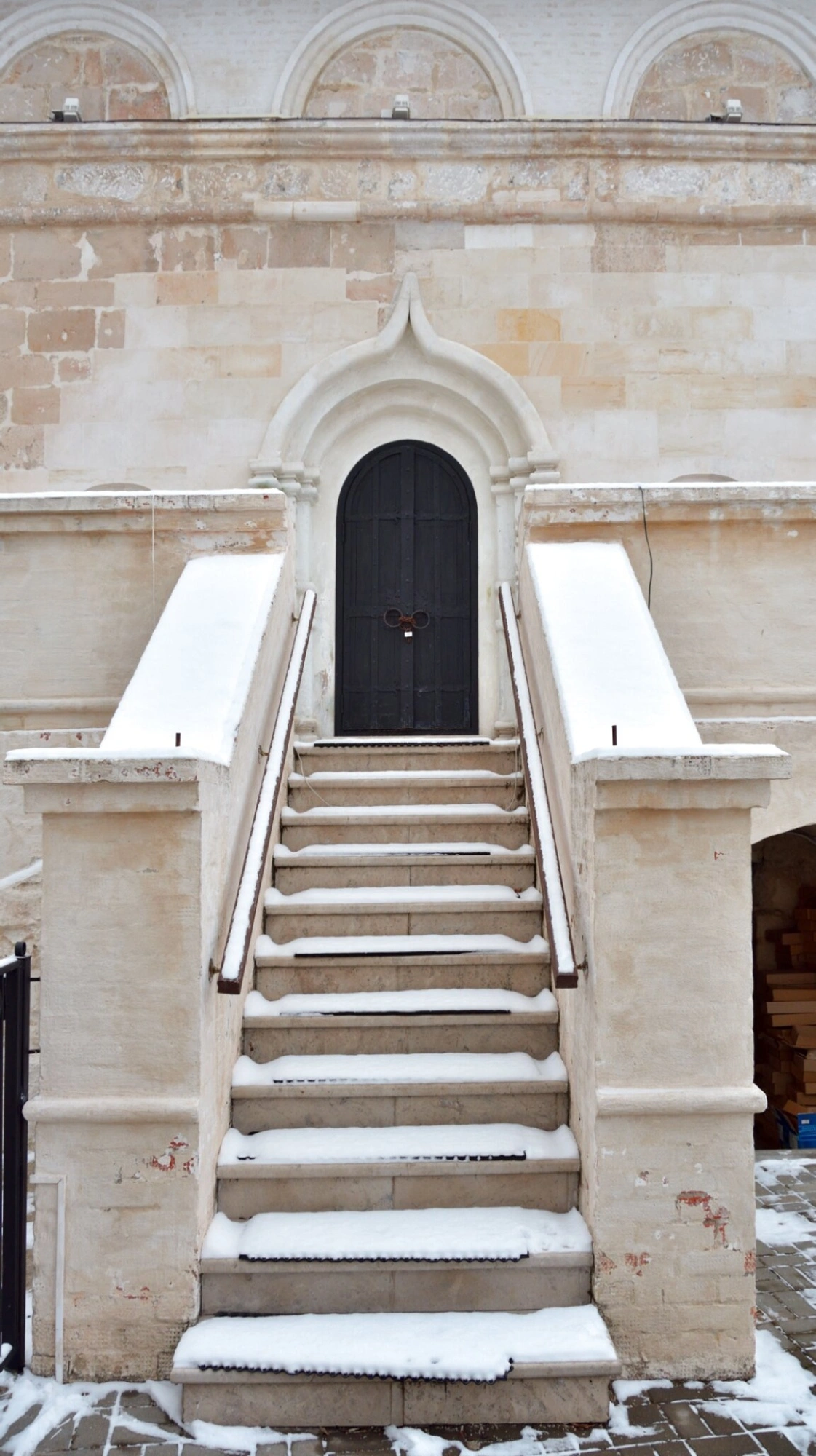 На представленной фотографии запечатлён главный вход в соборный храм Введения во храм Пресвятой Богородицы, являющийся центральным собором древнего Введенского Владычного женского монастыря в городе Серпухове. Снимок сделан в зимнее время, когда каменная лестница и прилегающая территория обители покрыты чистым снегом, что придаёт всей композиции особую благоговейную тишину и спокойствие.