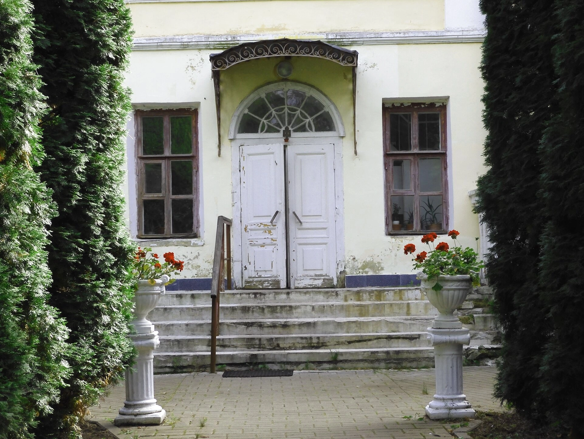 Центральным элементом композиции служат массивные двойные деревянные двери, увенчанные благолепной полукруглой аркой и укрытые под прочным кованым козырьком. Время оставило свой след на поверхности дверей, что лишь подчёркивает их древность и историческую ценность. По обе стороны от входа симметрично расположены прямоугольные окна с тёмными рамами, через которые в кельи братии проникал естественный свет.