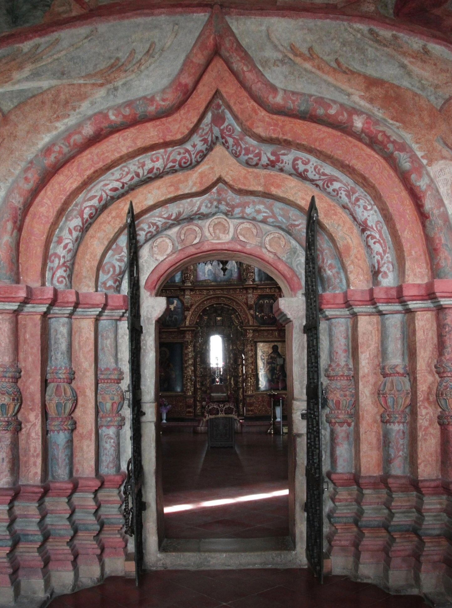 Собор, в который ведет этот вход, является spiritual центром монастыря и памятником русской церковной архитектуры. Каждая деталь сфотографированного интерьера отражает богатство православной традиции и мастерство древних русских зодчих, создавших этот уникальный храмовый комплекс.