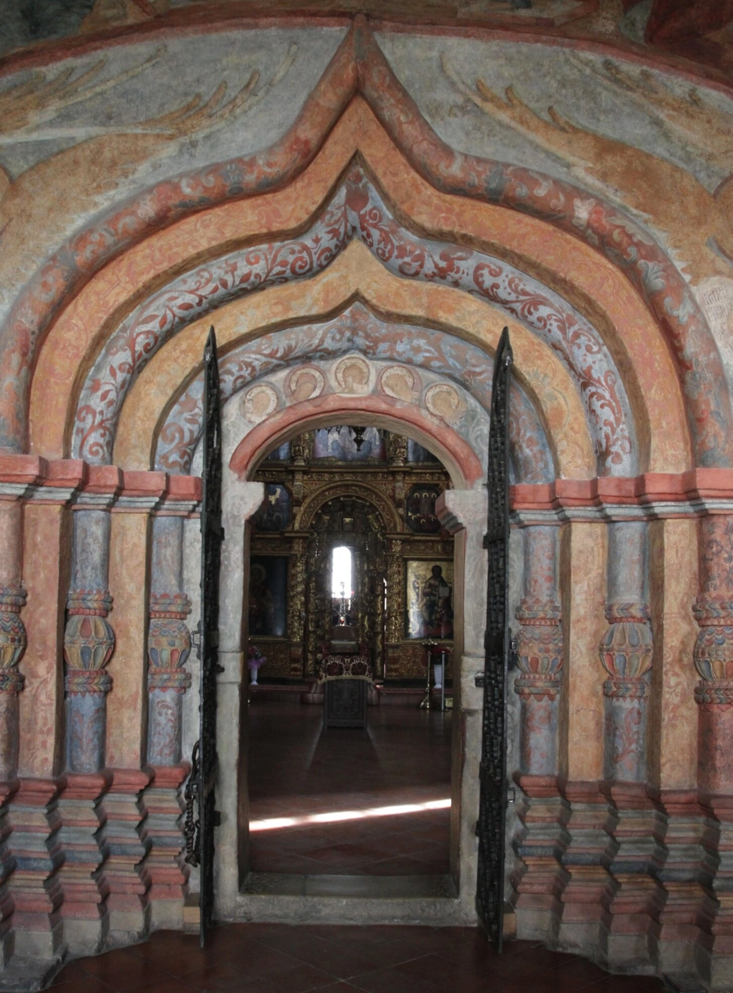 Архитектурное убранство проема поражает своим богатством: многоступенчатые арки, сложенные из разноцветных элементов, создают торжественное обрамление входа. Стены и своды обильно покрыты многослойной росписью с традиционными православными орнаментами и узорами. По сторонам расположены расписанные колонны с резными капителями, дополняющие величественный облик святыни.