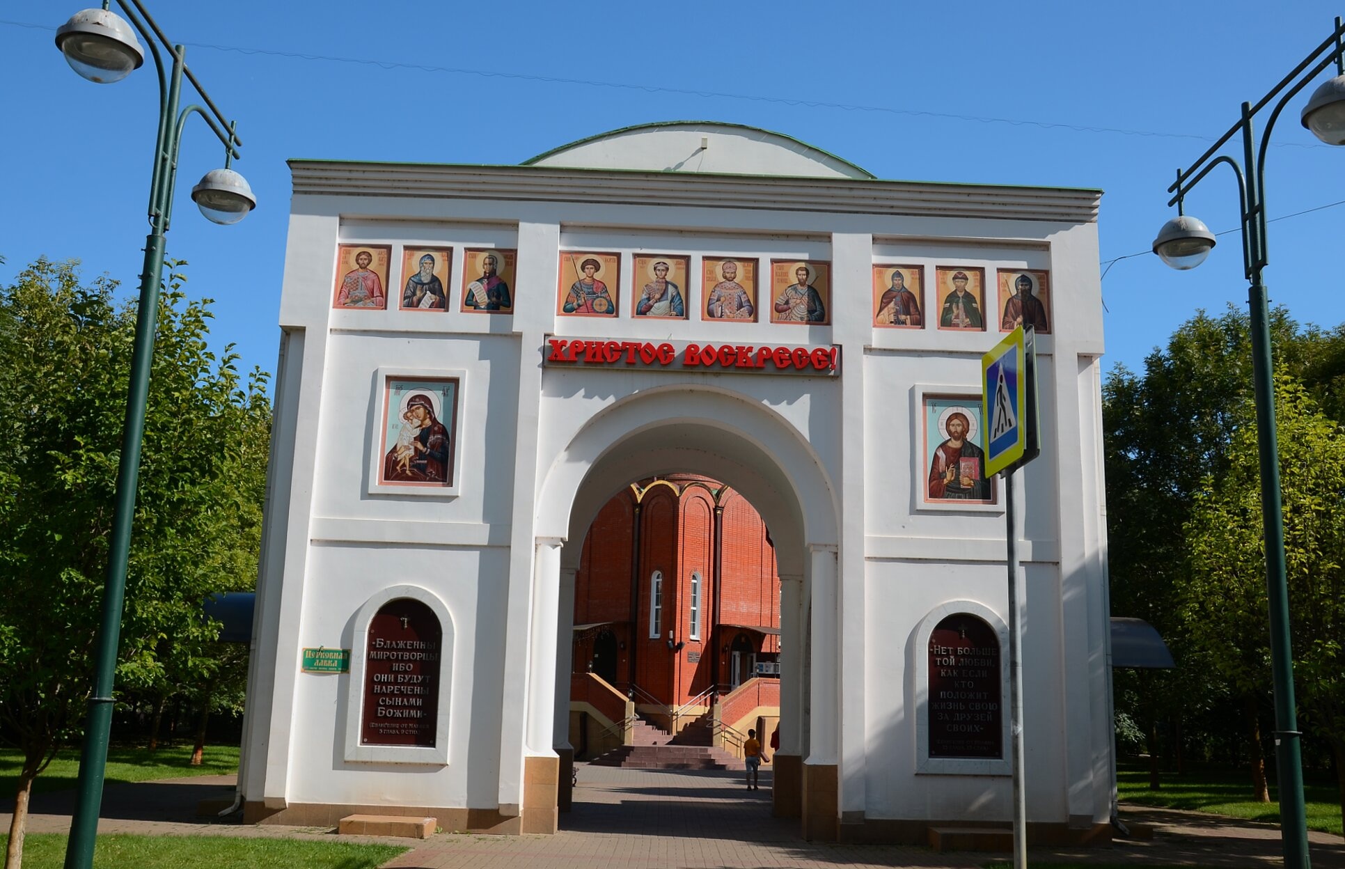 - Входная арка с надписью «ХРИСТОС ВОСКРЕСЕ» в храме Димитрия Солунского