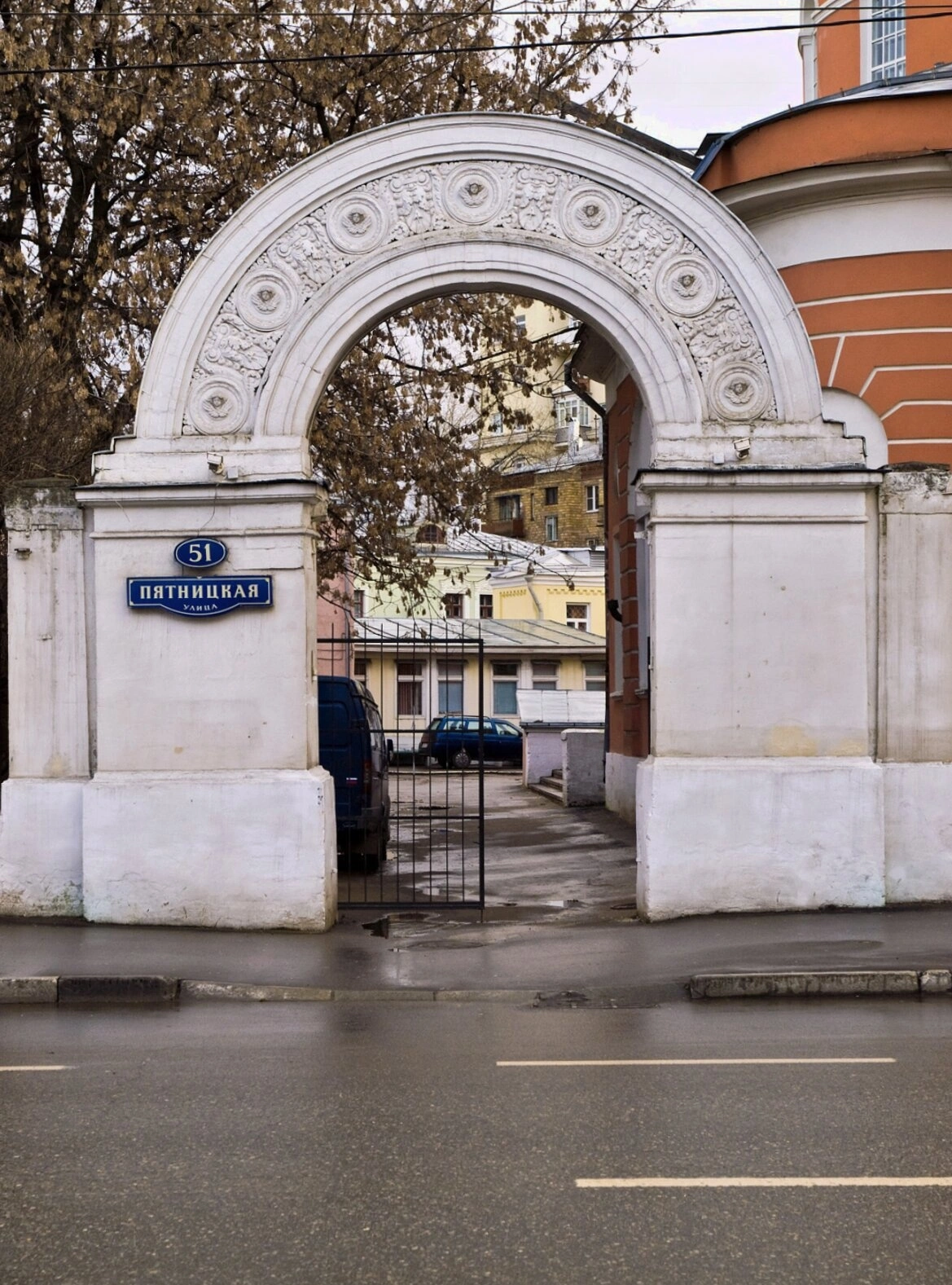 На представленной фотографии запечатлена монументальная каменная арка, служащая входом во двор старинного московского храма. Эта арка, расположенная по адресу Пятницкая улица, дом 51, является неотъемлемой частью архитектурного ансамбля Церкви Живоначальной Троицы, что в Вишняках. На лицевой части арки чётко видна табличка с указанием номера дома и названия улицы, что позволяет точно идентифицировать местоположение.
