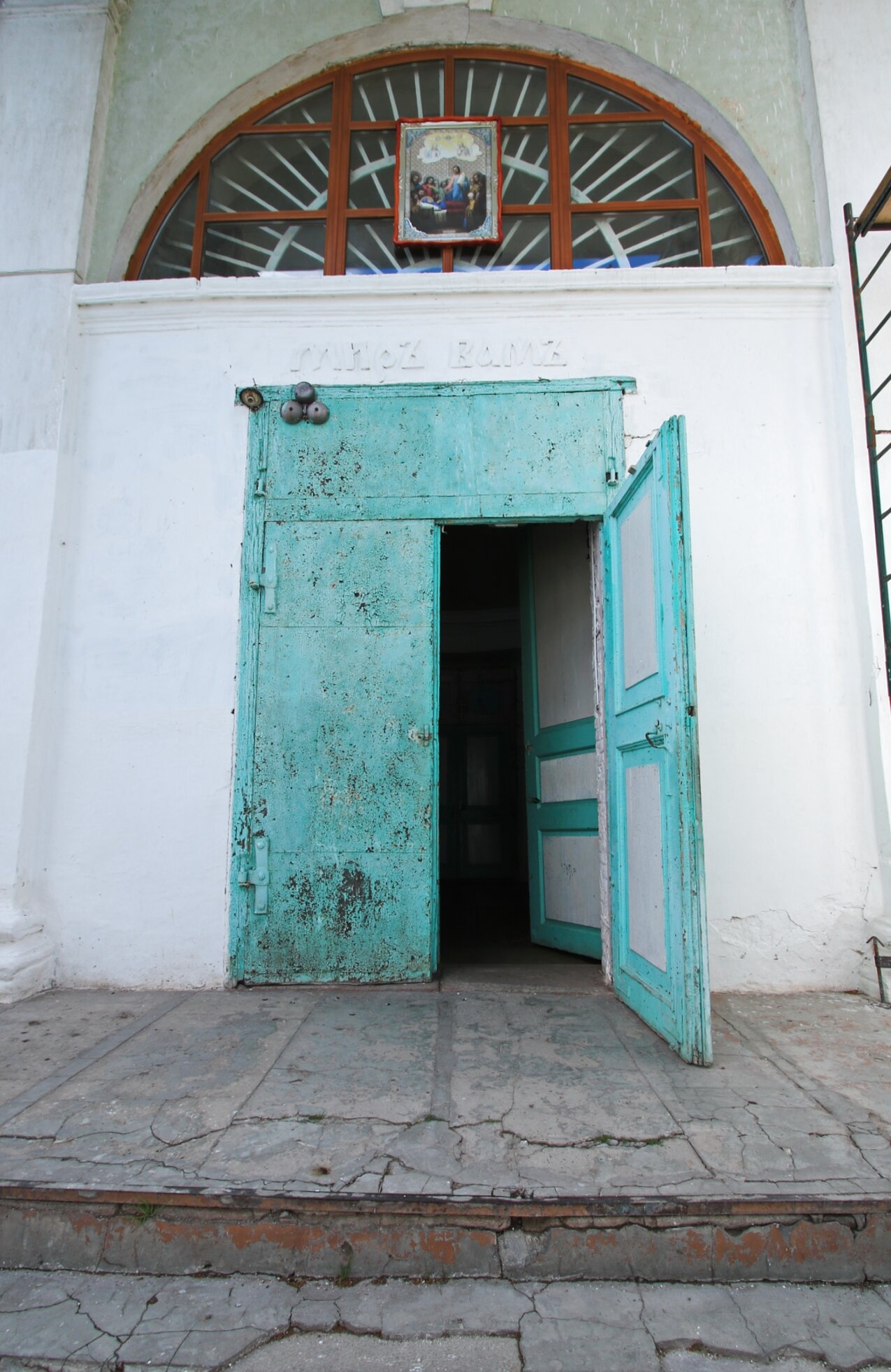 Массивная двустворчатая дверь бирюзового цвета, несмотря на следы временного воздействия в виде облупившейся краски и ржавчины, сохраняет своё величие и функциональность. Одна створка двери открыта, приглашая верующих внутрь, другая — приоткрыта, создавая динамику и ощущение доступности священного пространства. Над дверью расположено полукруглое окно-люнет, в котором размещена икона, предназначенная для благословения входящих и напоминания о молитве.