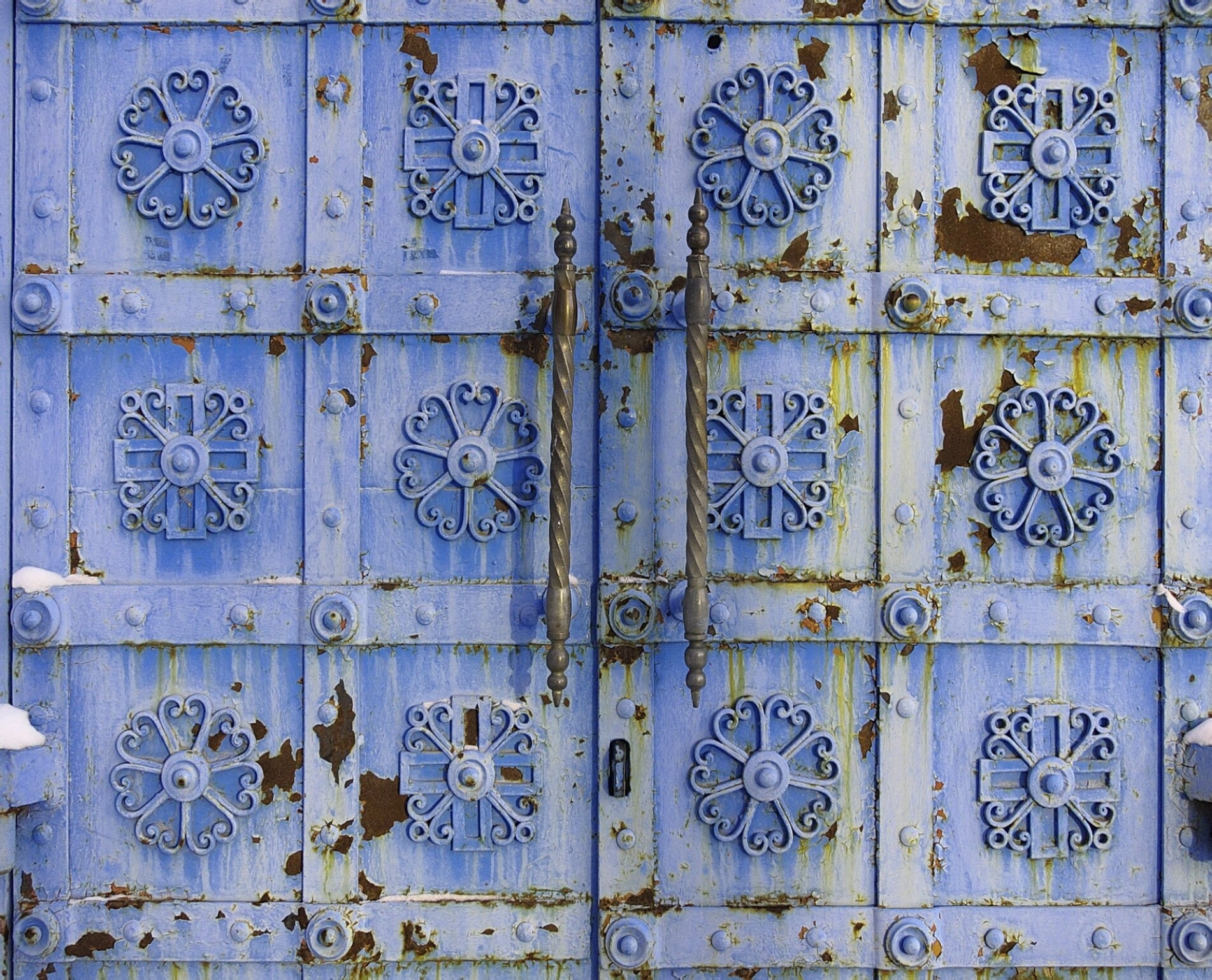 Дверное полотно, выполненное из прочного металла, окрашено в традиционный синий цвет, символизирующий небесную чистоту и Богородицу в православной иконографии. Время оставило на поверхности свои следы в виде облупившейся краски и благородной патины, что придаёт двери особый исторический шарм и напоминает о её долгом служении верующим.