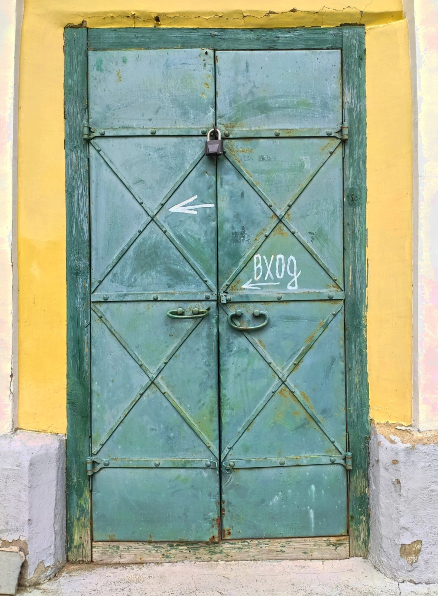 На представленной фотографии запечатлена входная металлическая дверь в Успенскую церковь, расположенную в селе Николо-Рожок Осташковского городского округа Тверской области. Дверь, выполненная из прочного металла и окрашенная в зелёный цвет, несёт на себе следы времени, что подчёркивает историческую ценность объекта. Декоративные кованые элементы, образующие крестообразный узор, не только выполняют функцию укрепления конструкции, но и несут глубокую символическую нагрузку, напоминая верующим о крестных страданиях Спасителя.