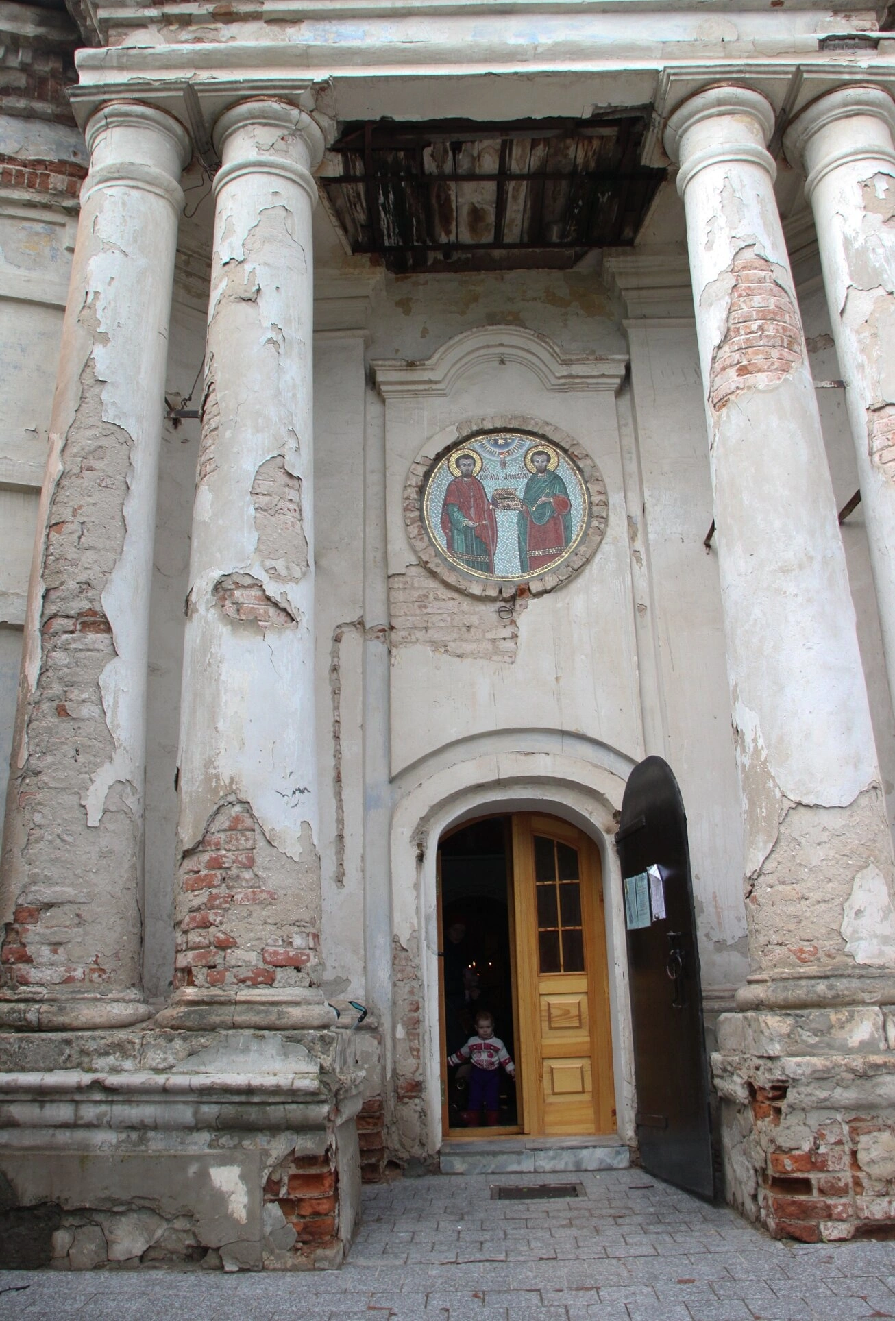 На представленной фотографии запечатлен главный вход в храм в честь святых бессребреников Космы и Дамиана, что располагается в городе Калуге. Храм является значимым памятником церковной архитектуры и объектом культурного наследия региона.