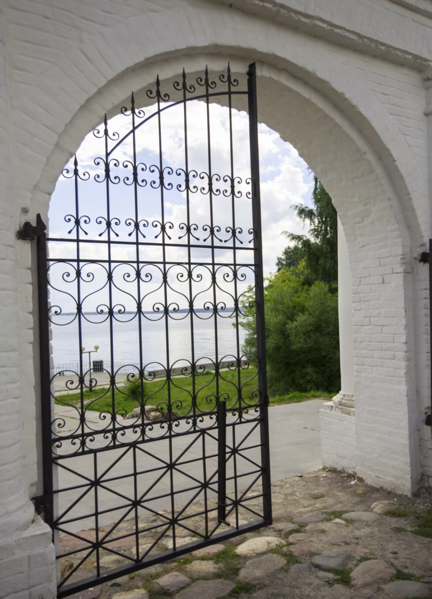 Через открытый проём взору открывается благодатный вид на величественную реку Волгу, воды которой освящены множеством православных святынь, стоящих на её берегах. Зелёные массивы на противоположном берегу реки создают ощущение умиротворения и покоя, гармонируя со святостью этого места. Мощёная камнем дорожка, виднеющаяся в нижней части изображения, ведёт богомольцев от входа непосредственно к храму.