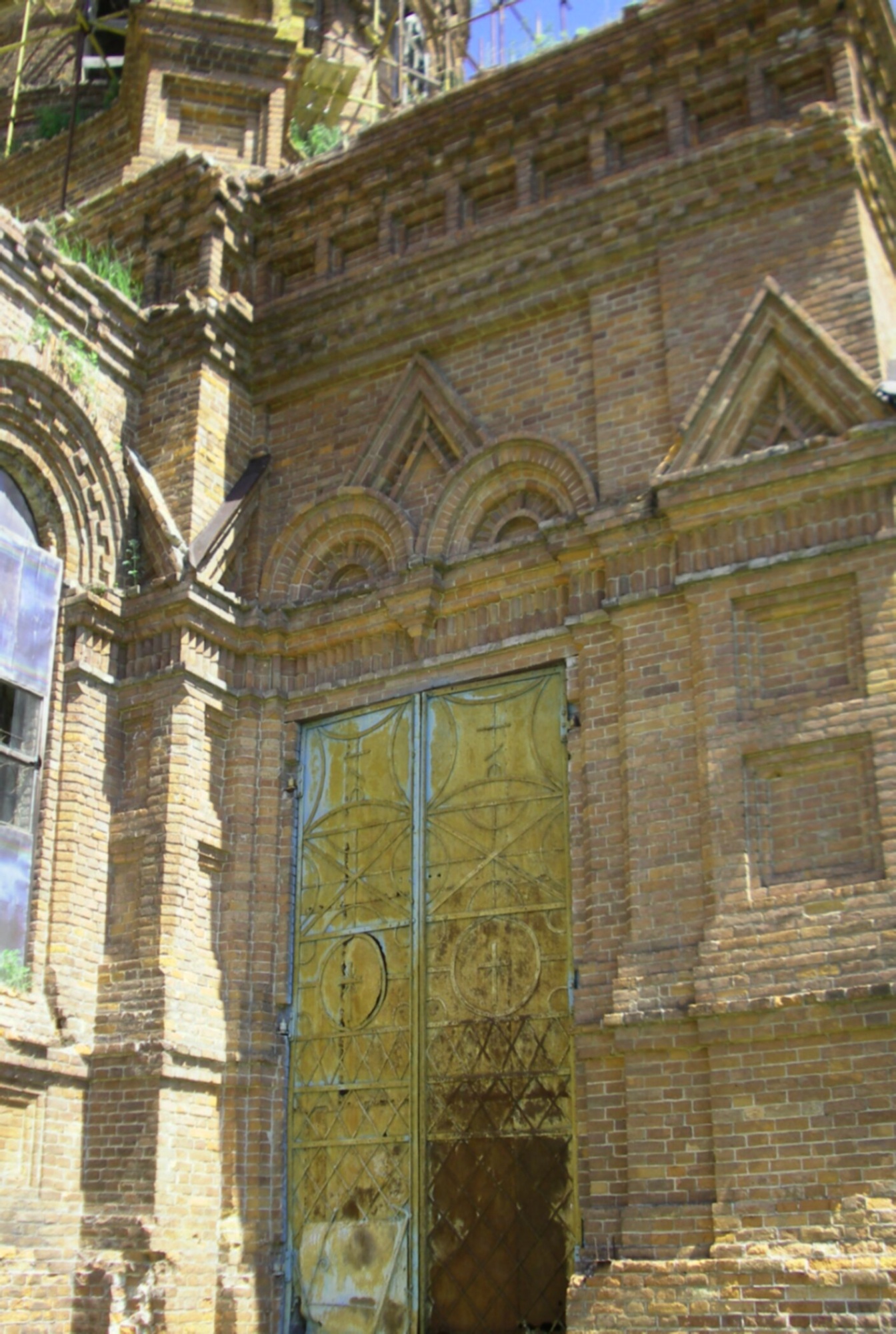 Дверной проём обрамлён кирпичной кладкой, выполненной в традициях русского храмового зодчества. Чётко читаются элементы архитектурного декора: арочное завершение проёма и ступенчатые пилястры, подчёркивающие монументальность входа. Слева от дверей просматривается заложенный оконный проём, а также фрагменты штукатурного слоя, местами осыпавшегося и утраченного.