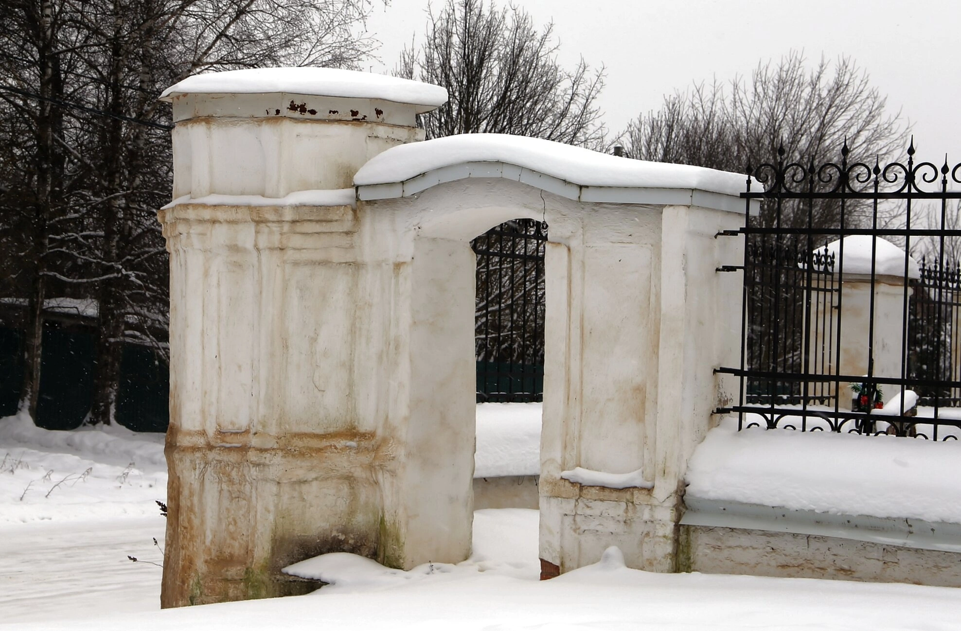 Каменная ограда с массивными башнями, одна из которых изображена на фото, была возведена во второй половине XVIII века и является характерным образцом монастырского и храмового зодчества того времени. Она не только обозначает границы церковной земли, но и символизирует духовное отделение мира горнего от мира дольнего. Калитка, ведущая на территорию храма, приглашает верующих переступить порог для молитвы и поклонения.