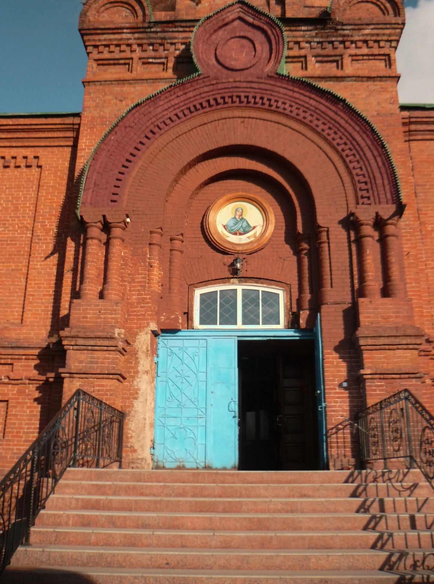 На фотографии запечатлён главный вход в Покровский кафедральный собор города Барнаула — один из старейших и наиболее почитаемых православных храмов Алтая. Снимок детально передаёт благолепие церковной архитектуры конца XIX века.