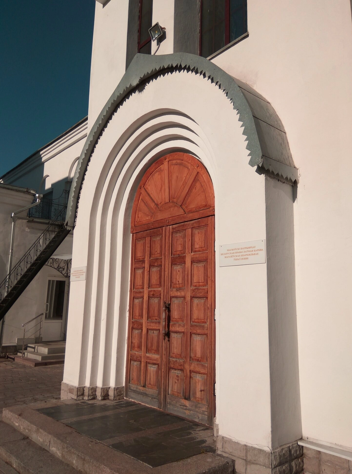 На представленной фотографии запечатлён главный вход в Собор Трёх Святителей, являющийся кафедральным храмом Могилёвской епархии Белорусской Православной Церкви. Снимок детально показывает благолепие церковного портала, через который верующие попадают в священное пространство храма для молитвы.