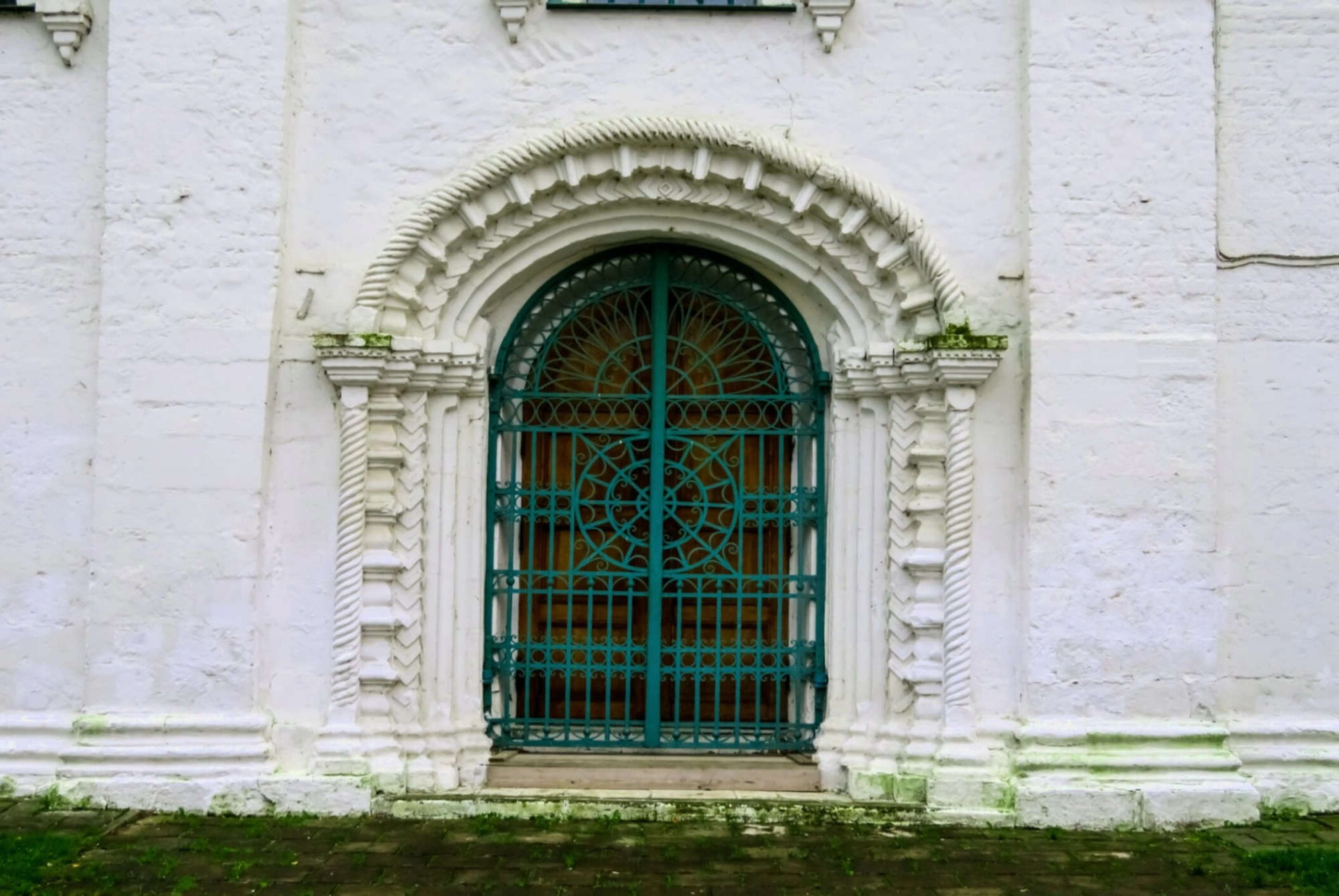 Вход в святыню закрывает массивная кованая решетка зеленого цвета, изготовленная местными кузнецами. В узоре решетки гармонично переплетаются геометрические элементы с растительными мотивами, а в центре композиции расположен круглый медальон, напоминающий солнце. Такие решетки не только выполняли защитную функцию, но и символизировали ограду райского сада.