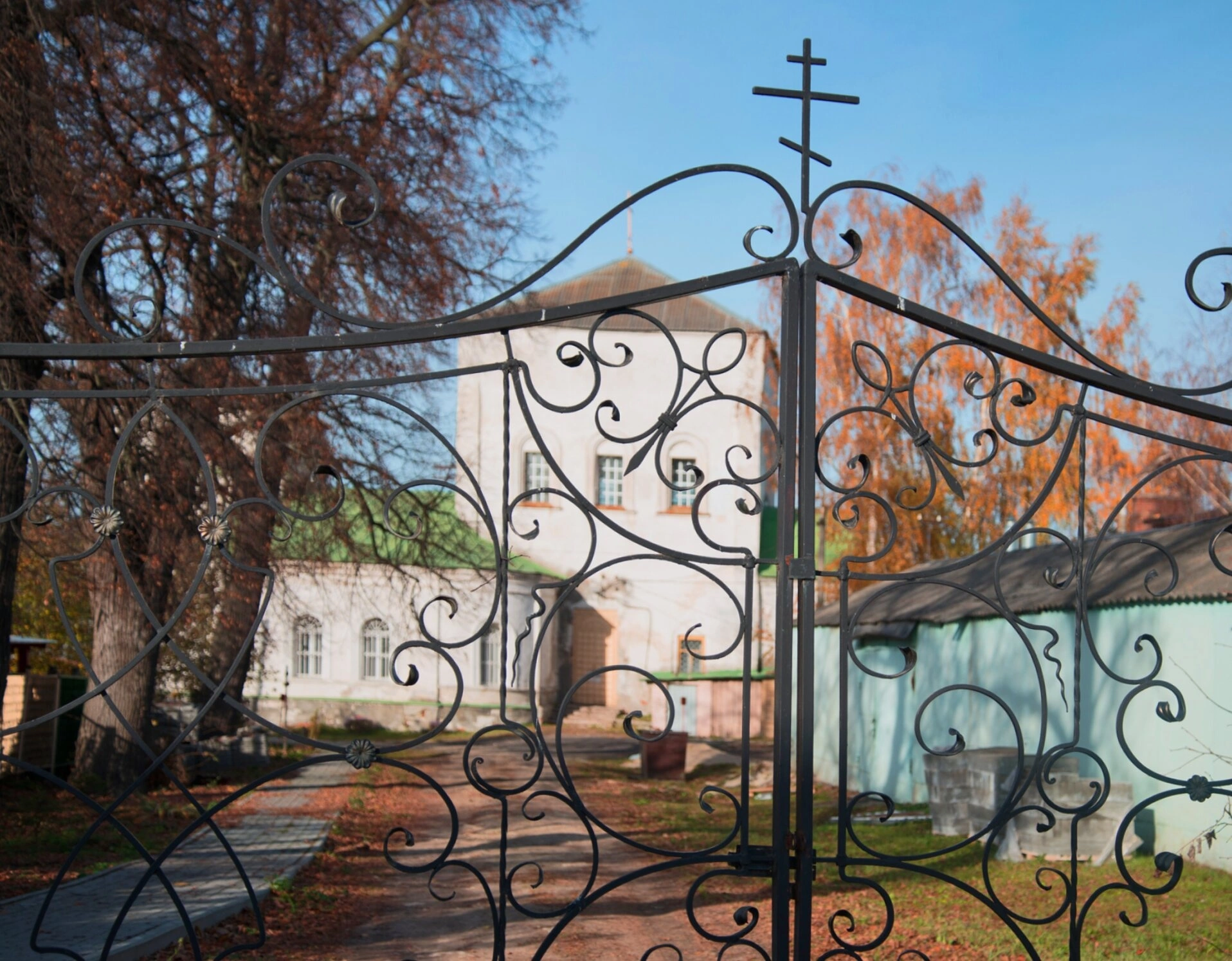 За ажурной ковкой ворот открывается вид на светлый архитектурный ансамбль церковных построек, утопающих в золоте осенней листвы. Деревья, облачённые в багрянец и золото, создают умиротворённую картину тихого осеннего дня, наполняя пространство благодатным спокойствием.