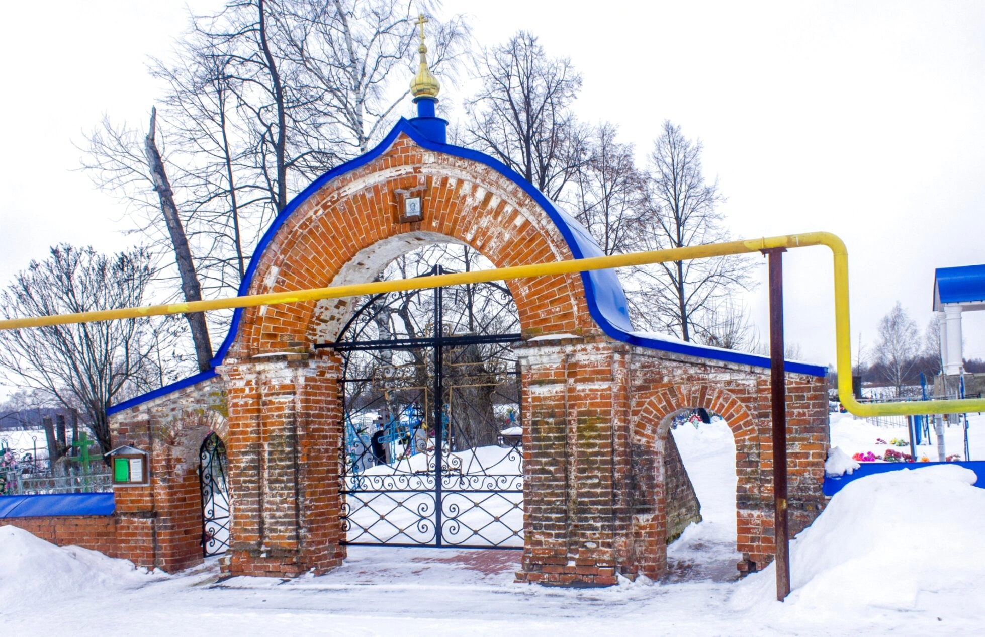 Слева от входа просматривается фрагмент синего кирпичного ограждения, обозначающего границы церковной земли. Справа над снегом проходит жёлтая газовая труба, свидетельствующая о современном благоустройстве территории храма. Отсутствие людей на снимке позволяет сосредоточить внимание на архитектурных деталях и духовной атмосфере этого святого места.