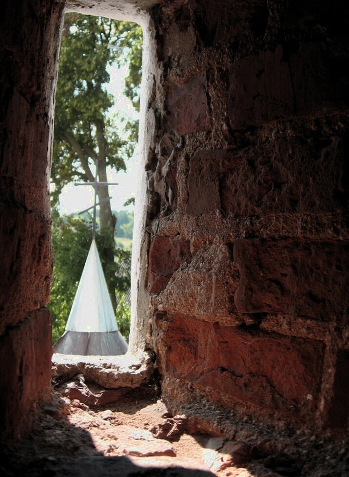На представленной фотографии запечатлён уникальный вид, открывающийся из узкого арочного оконного проёма Церкви Рождества Пресвятой Богородицы, что в агрогородке Мурованка Щучинского района Гродненской области. Мощные стены храма, сложенные из грубого тёсаного камня и кирпича, создают величественную и суровую рамку для созерцания внешнего мира. Толщина этих стен, прорезанных окнами-бойницами, красноречиво свидетельствует о оборонительном предназначении этого сакрального сооружения, возведённого в первой половине XVI столетия.