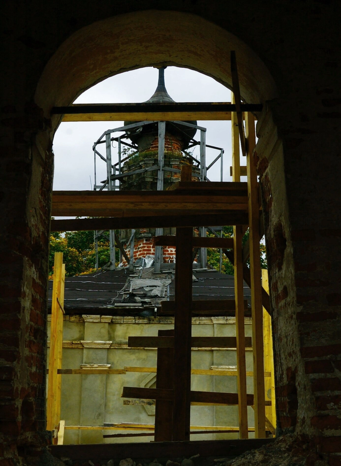Через оконный проём открывается трогательный вид на внешнюю часть здания, где можно различить металлический каркас, поддерживающий конструкцию купола, и элементы кирпичной кладки. Несмотря на признаки временного запустения и незавершённости ремонта, в архитектурных формах угадывается былой благолепный облик православного храма, несущего в себе традиции русского церковного зодчества.